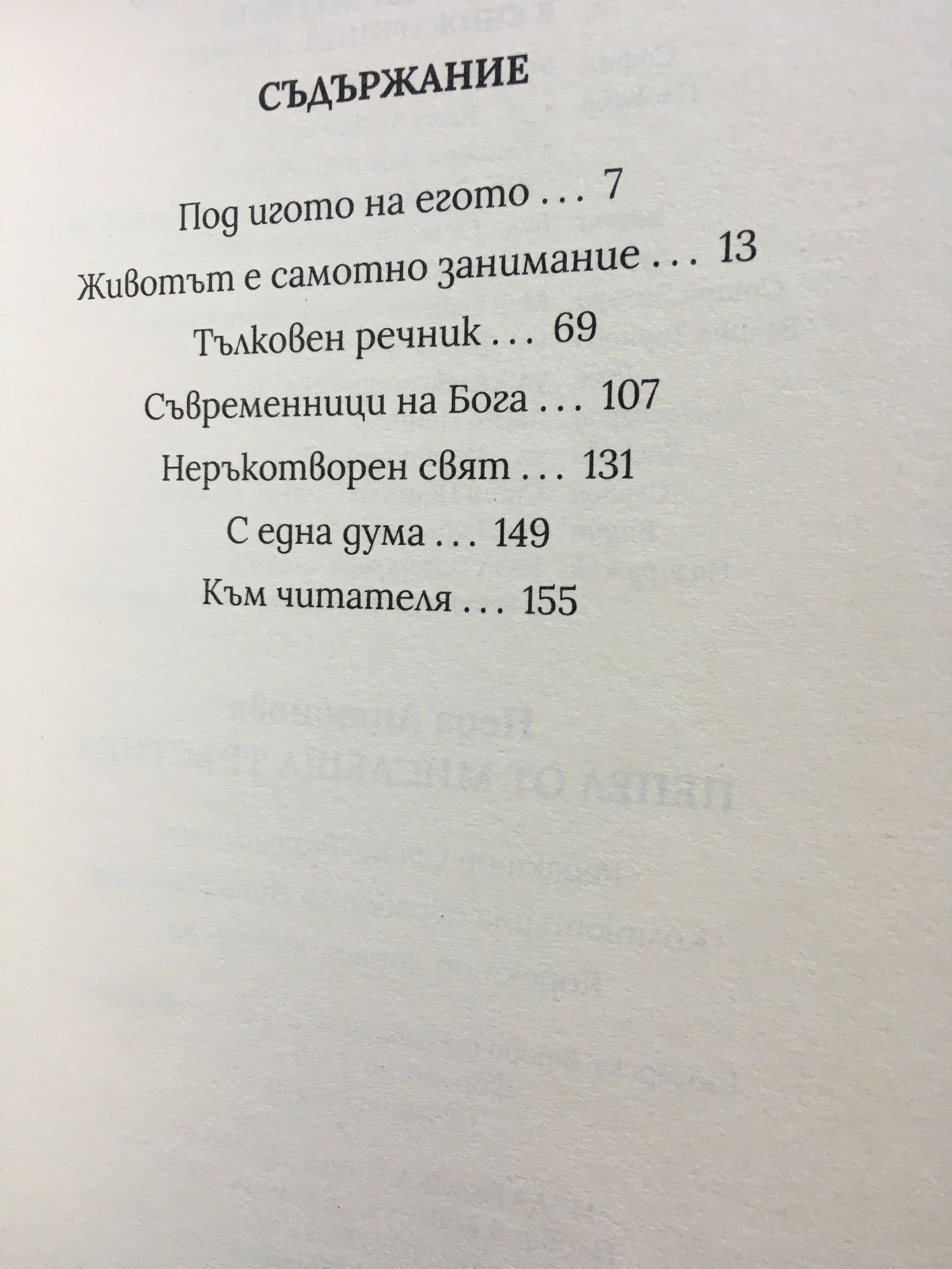 Животът на всеки от нас се побира в десетина изречения. Има дни, дори години, минали, без да ни оставят спомен. Като че друг ги е живял вместо нас. Човек невинаги знае, че е жив. И идва ден, когато – за да се увери! – той си брои белезите: външни – от нанесените му рани, вътрешни – от раните, които той е нанасял. Тази книга е такава: сборник белези от съществуването. Тук са подбрани дори синините, с които идните битки ще ме отличат. Авторката