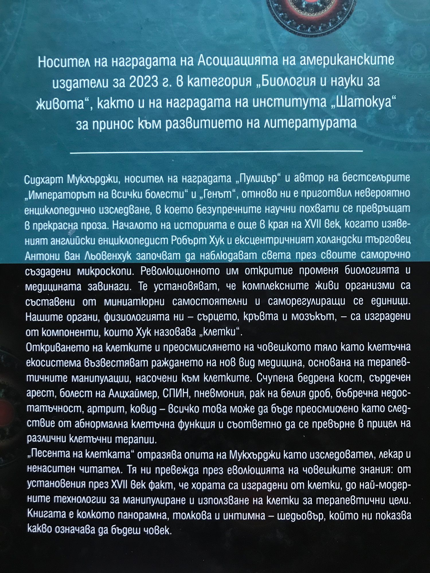 Сидхарт Мукхърджи, носител на наградата „Пулицър“ и автор на бестселърите „Императорът на всички болести“ и „Генът“, отново ни е приготвил невероятно енциклопедично изследване, в което безупречните научни похвати се превръщат в прекрасна проза. Началото на историята е още в края на XVII век, когато изявеният английски енциклопедист Робърт Хук и ексцентричният холандски търговец Антони ван Льовенхук започват да наблюдават света през своите саморъчно създадени микроскопи. Революционното им откритие променя биологията и медицината завинаги. Те установяват, че комплексните живи организми са съставени от миниатюрни самостоятелни и саморегулиращи се единици. Нашите органи, физиологията ни – сърцето, кръвта и мозъкът – са изградени от компоненти, които Хук назовава „клетки“. Откриването на клетките и преосмислянето на човешкото тяло като клетъчна екосистема възвестяват раждането на нов вид медицина, основана на терапевтичните манипулации, насочени към клетките. Счупена бедрена кост, сърдечен арест, болест на Алцхаймер, СПИН, пневмония, рак на белия дроб, бъбречна недостатъчност, артрит, ковид – всичко това може да бъде преосмислено като следствие от абнормална клетъчна функция и съответно да се превърне в прицел на различни клетъчни терапии. „Песента на клетката“ отразява опита на Мукхърджи като изследовател, лекар и ненаситен читател. Тя ни превежда през еволюцията на човешките знания: от установения през XVII век факт, че хората са изградени от клетки, до най-модерните технологии за манипулиране и използване на клетки за терапевтични цели. Книгата е колкото панорамна, толкова и интимна – шедьовър, който ни показва какво означава да бъдеш човек.