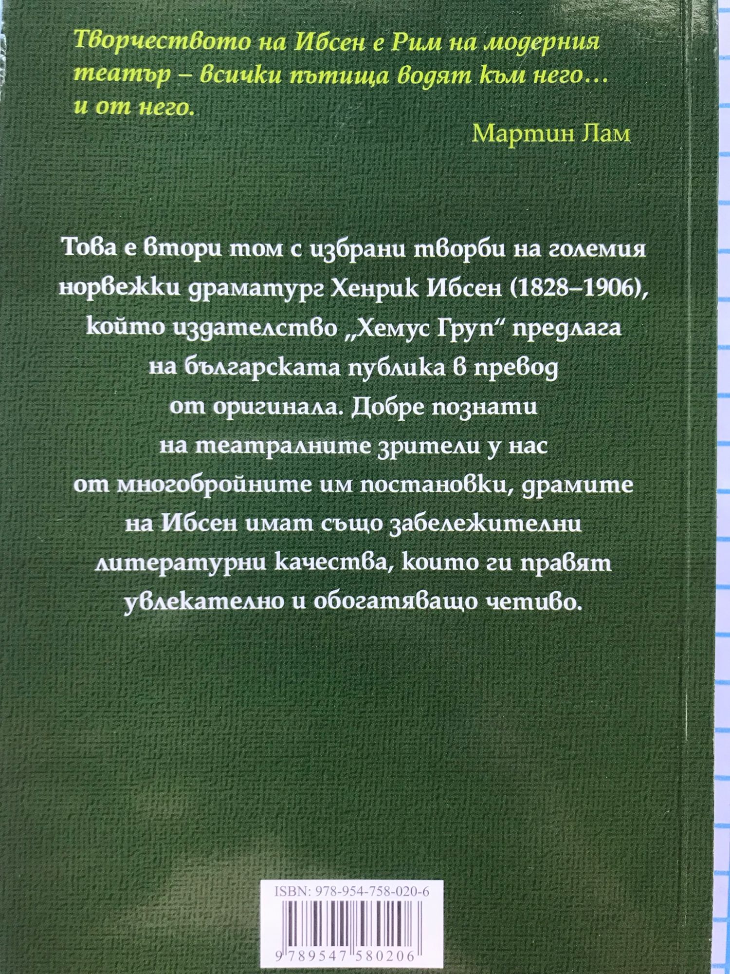 Това е втори том с избрани творби на големия норвежки драматург Хенрик Ибсен (1828-1906), който издателство „Хемус Груп" предлага на българската публика в превод от оригинала. Добре познати на театралните зрители у нас от многобройните им постановки, драмите на Ибсен имат също забележителни литературни качества, които ги правят увлекателно и обогатяващо четиво. Творчеството на Ибсен е Рим на модерния театър - всички пътища водят към него... и от него. Мартин Лам