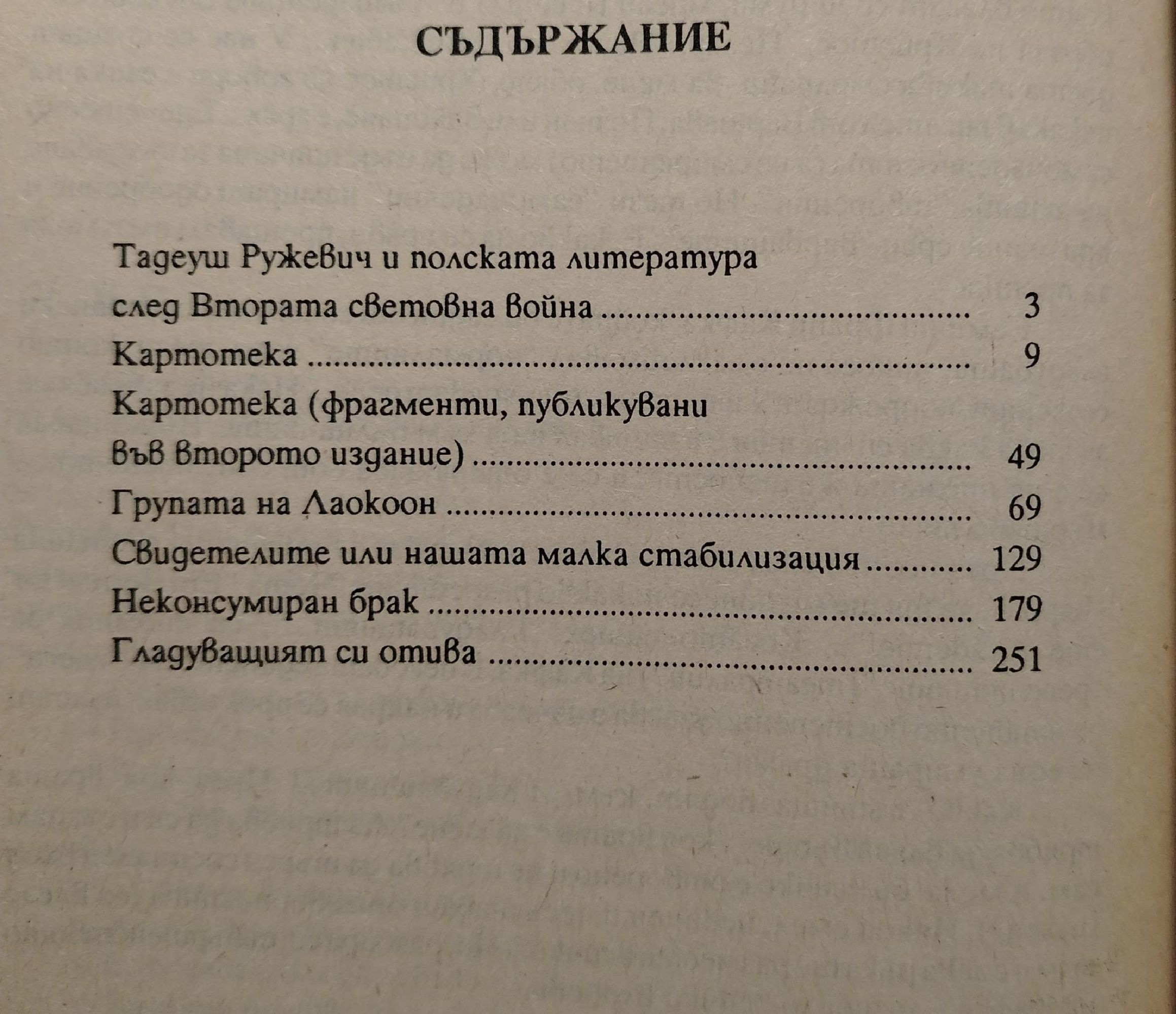 Картотека / Групата на Лаокоон / Свидетелиоте или нашата малка стабилизация / Неконсумиран брак / Гладуващият си отива