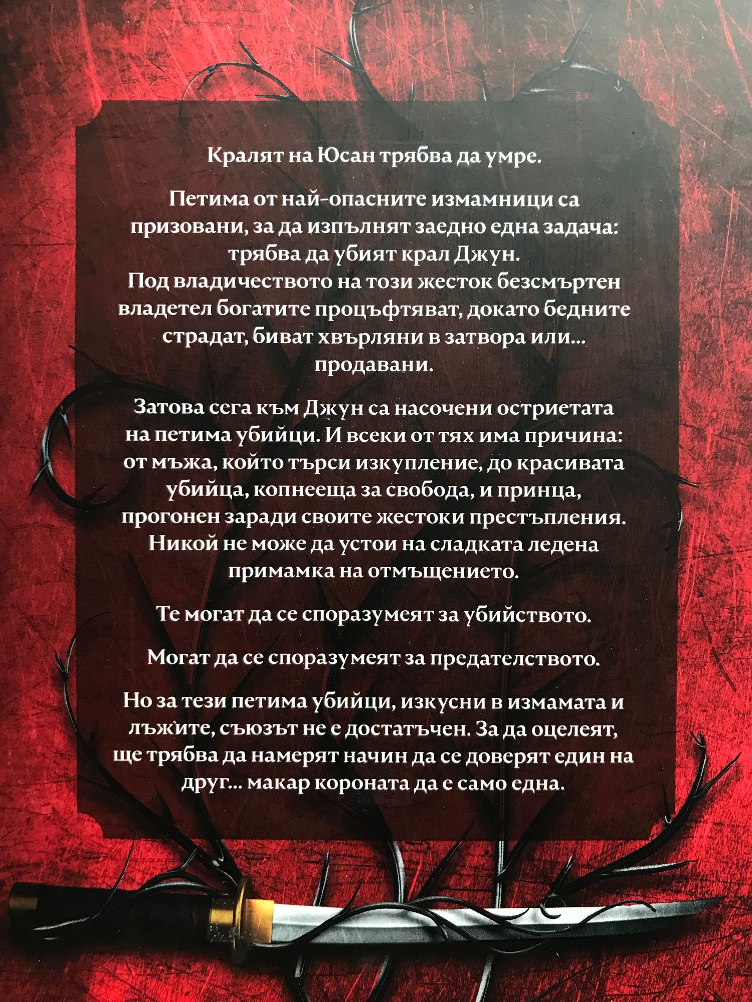 Кралят на Юсан трябва да умре. Петима от най-опасните измамници са призовани, за да изпълнят заедно една задача: трябва да убият крал Джун. Кралят си го заслужава. Под владичеството на този жесток безсмъртен владетел богатите процъфтяват, докато бедните страдат, биват хвърляни в затвора или… продавани. Затова сега към Джун са насочени остриетата на петима убийци. И всеки от тях има причина: от наемния асасин, който търси изкупление, през красивата убийца, копнееща за свобода, до принца, прогонен заради своите жестоки престъпления. Никой не може да устои на сладката ледена примамка на отмъщението. Те могат да се споразумеят за убийството. Могат да се споразумеят за предателството. Но за тези петима убийци, изкусни в измамата и лъжите, съюзът не е достатъчен. За да оцелеят, ще трябва да намерят начин да се доверят един на друг… макар короната да е само една.