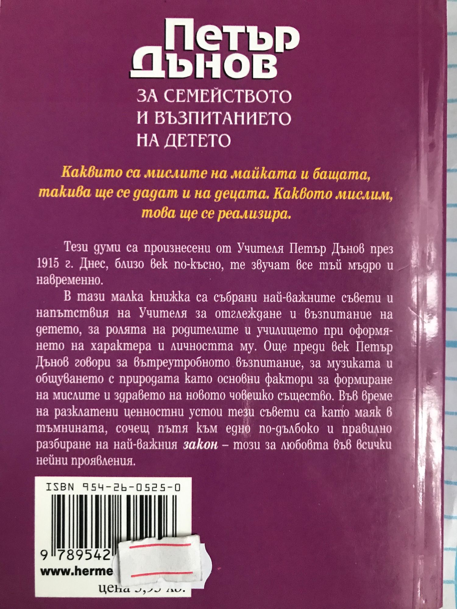 В тази малка книжка са събрани най-важните съвети и напътствия на Учителя за отглеждане и възпитание на детето, за ролята на родителите и училището при оформянето на характера и личността му. Още преди век Петър Дънов говори за вътреутробното възпитание, за музиката и общуването с природата като основни фактори за формиране на мисли и здравето на новото човешко същество. Във време на разклатени ценностни устои тези съвети са маяк в тъмнината, сочещ пътя към едно по-дълбоко и правилно разбиране на най-важния закон – този за любовта във всички нейни проявления.