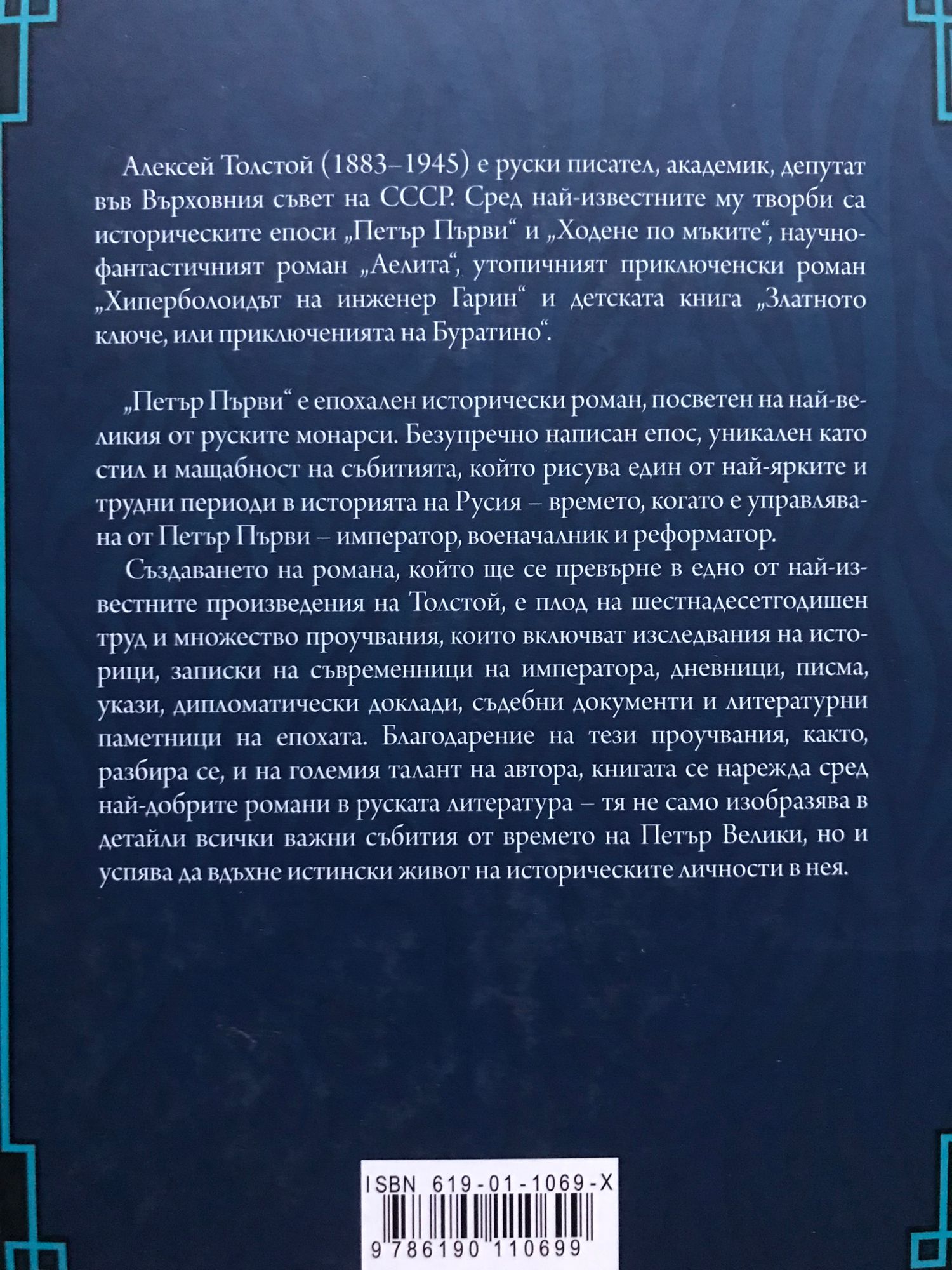 „Петър Първи“ е епохален исторически роман, посветен на най-великия от руските монарси. Безупречно написан епос, уникален като стил и мащабност на събитията, който рисува един от най-ярките и трудни периоди в историята на Русия – времето, когато е управлявана от Петър I – император, военачалник и реформатор. Създаването на романа, който ще се превърне в едно от най-известните произведения на Толстой, е плод на шестнадесетгодишен труд и множество проучвания, които включват изследвания на историци, записки на съвременници на императора, дневници, писма, укази, дипломатически доклади, съдебни документи и литературни паметници на епохата. Благодарение на тези проучвания, както разбира се и на големия талант на автора, книгата се нарежда сред най-добрите романи в руската литература – тя не само изобразява в детайли всички важни събития от времето на Петър Велики, но и успява да вдъхне истински живот на историческите личности в нея. Алексей Толстой (1883–1945) е руски писател, академик, депутат във Върховния съвет на СССР. Сред най-известните му творби са историческите епоси „Петър Първи“ и „Ходене по мъките“, научнофантастичният роман „Аелита“, утопичният приключенски роман „Хиперболоидът на инженер Гарин“ и детската книга „Златното ключе, или приключенията на Буратино“.