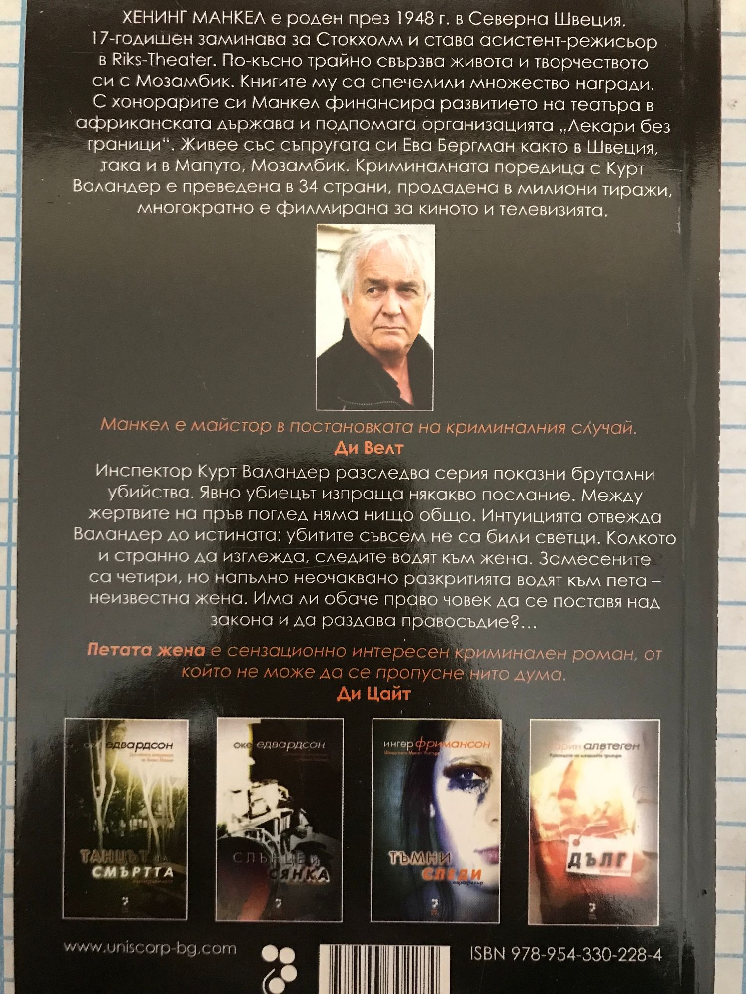 Инспектор Курт Валандер разследва серия показни брутални убийства. Явно убиецът изпраща някакво послание. Между жертвите на пръв поглед няма нищо общо. Интуицията отвежда Валандер до истината: убитите съвсем не са били светци. Колкото и странно да изглежда, следите водят към жена. Замесените са четири, но напълно неочаквано разкритията водят към пета — неизвестна жена. Има ли обаче право човек да се поставя над закона и да раздава правосъдие? Хенинг Манкел е роден през 1948 г. в Северна Швеция. 17-годишен заминава за Стокхолм и става асистент-режисьор в Riks Theater. По-късно свързва трайно живота и творчеството си с Мозамбик. Книгите му са спечелили множество награди. С хонорарите си Манкел финансира развитието на театъра в африканската държава и подпомага организацията „Лекари без граници“. Живее със съпругата си Ева Бергман както в Швеция така и в Мапуто, Мозамбик. Криминалната поредица с Курт Валандер е преведена в 34 страни, продадена в милиони тиражи и многократно е филмирана за киното и телевизията.