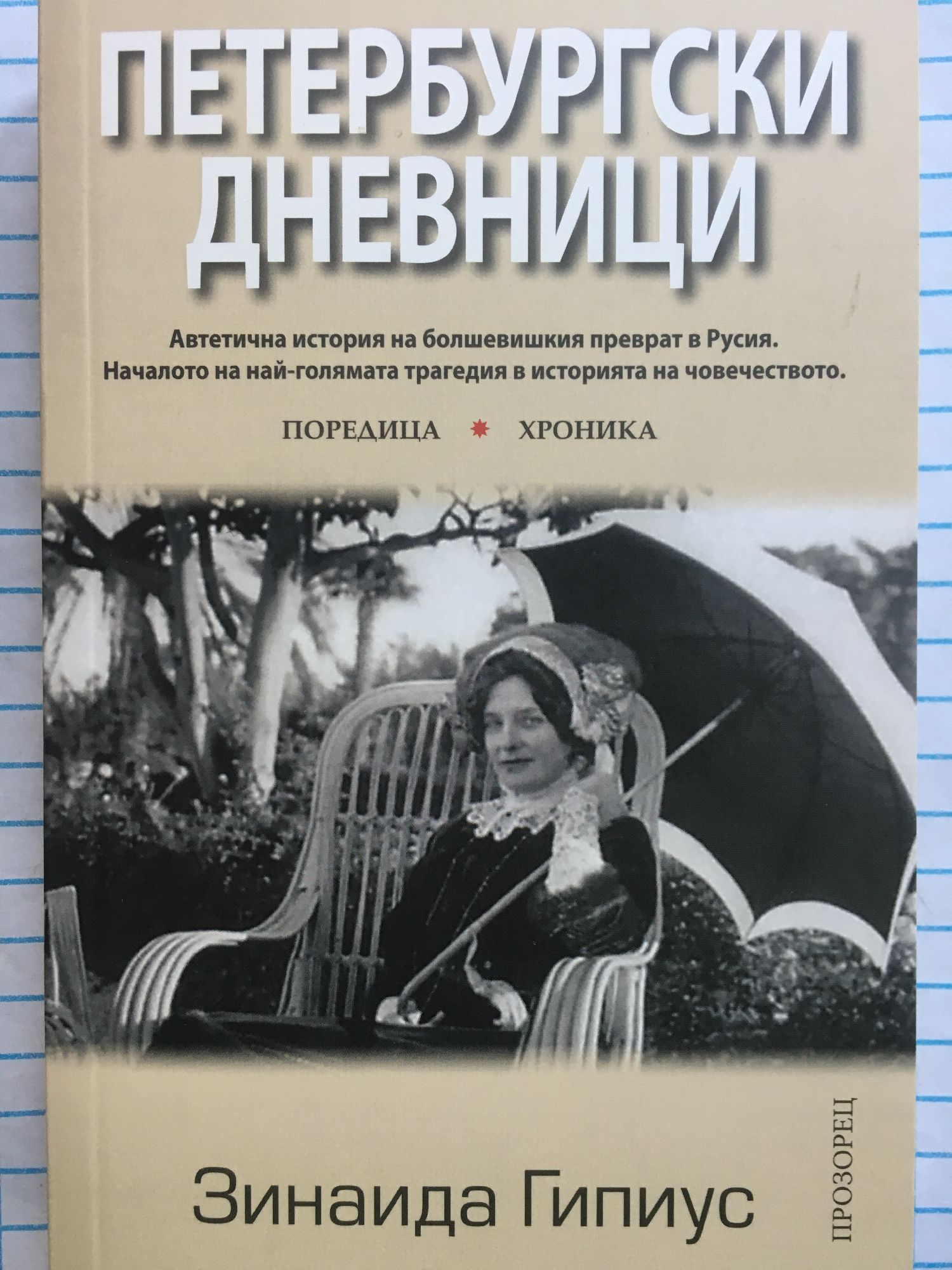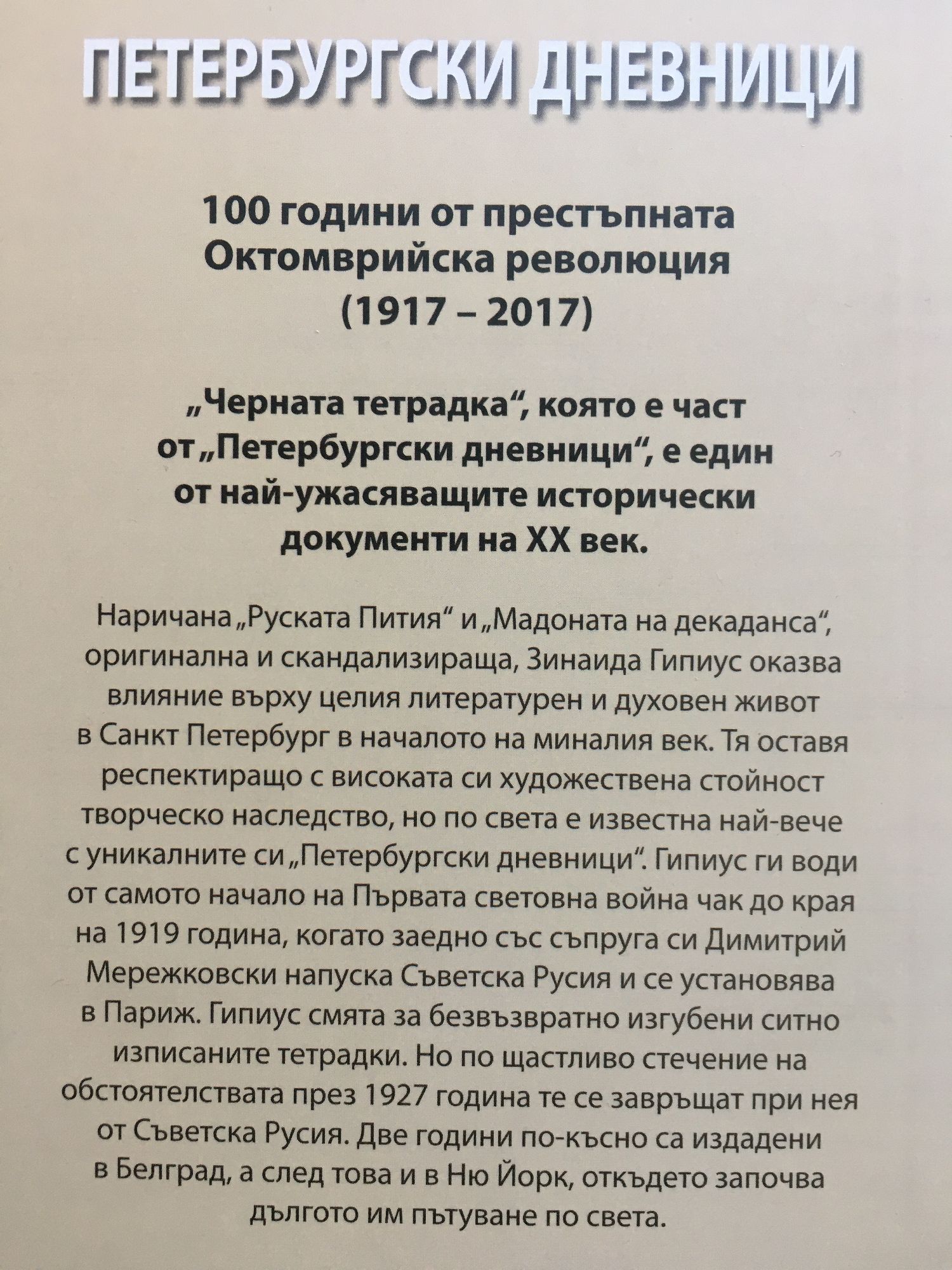100 години от престъпната Октомврийска революция (1917 - 2017). "Черната тетрадка", която е част от "Петербургски дневници" е един от най-ужасяващите исторически документи на ХХ век. Наричана "Руската Пития" и "Мадоната на декаданса", оригинална и скандализираща, Зинаида Гипиус оказва влияние върху целия литературен и духовен живот в Санкт Петербург в началото на миналия век. Тя оставя респектиращо с високата си художествена стойност творческо наследство, но по света е известна най-вече с уникалните си "Петербургски дневници". Гипиус ги води от самото начало на Първата световна война чак до края на 1919 година, когато заедно със съпруга си Дмитрий Мережковски напуска Съветска Русия и се установява в Париж. Гипиус смята за безвъзвратно изгубени ситно изписаните тетрадки. Но по щастливо стечение на обстоятелствата през 1927 година те се завръщат при нея от Съветска Русия. Две години по-късно са издадени в Белград, а след това и в Ню Йорк, откъдето започва дългото им пътуване по света.