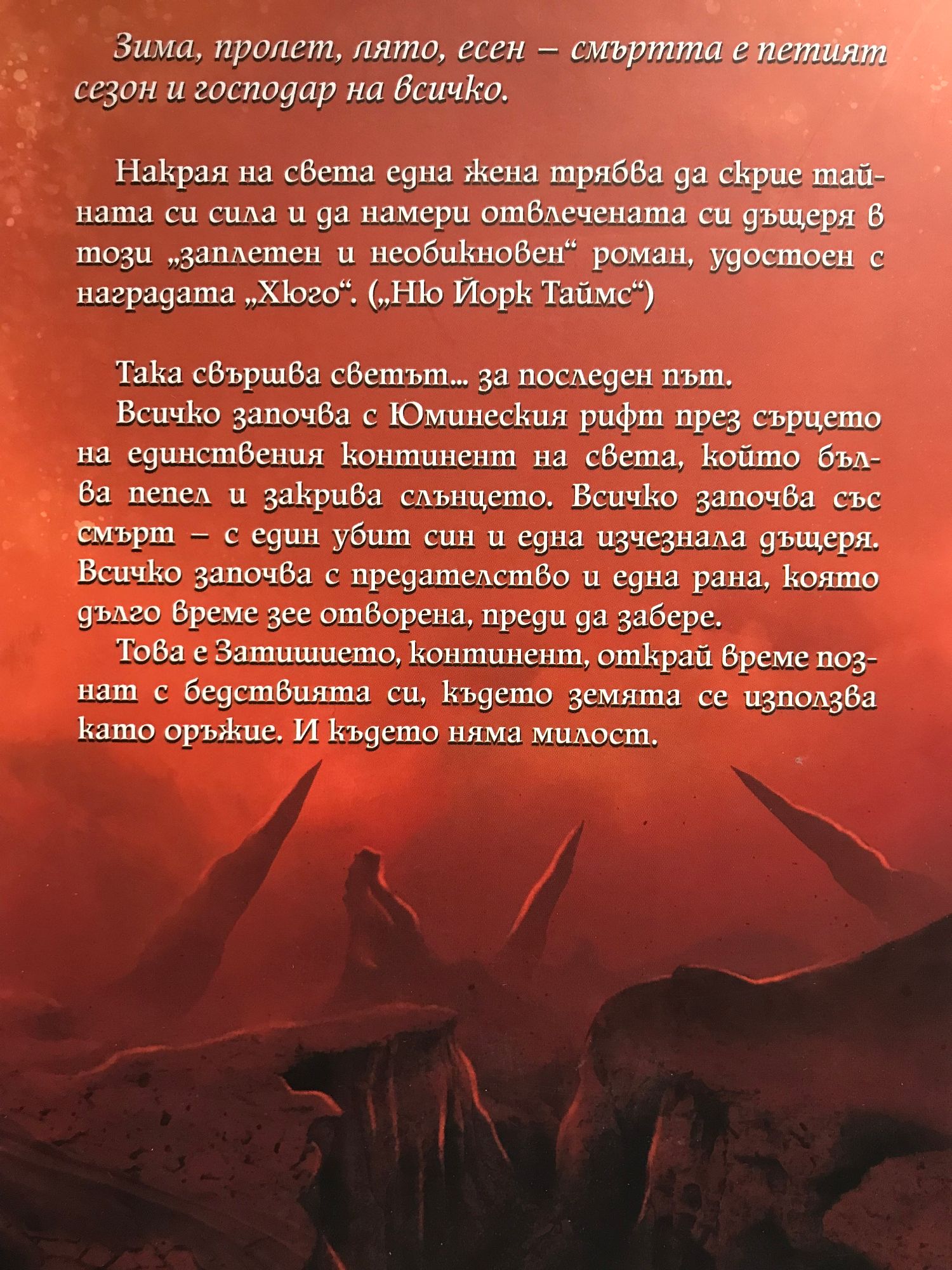 Зима, пролет, лято, есен – смъртта е петият сезон и господар на всичко. Накрая на света една жена трябва да скрие тайната си сила и да намери отвлечената си дъщеря в този „заплетен и необикновен“ роман, удостоен с наградата „Хюго“. („Ню Йорк Таймс“) Така свършва светът… за последен път. Всичко започва с Юминеския рифт през сърцето на единствения континент на света, който бълва пепел и закрива слънцето. Всичко започва със смърт – с един убит син и една изчезнала дъщеря. Всичко започва с предателство и една рана, която дълго време зее отворена, преди да забере. Това е Затишието, континент, открай време познат с бедствията си, където земята се използва като оръжие. И където няма милост.