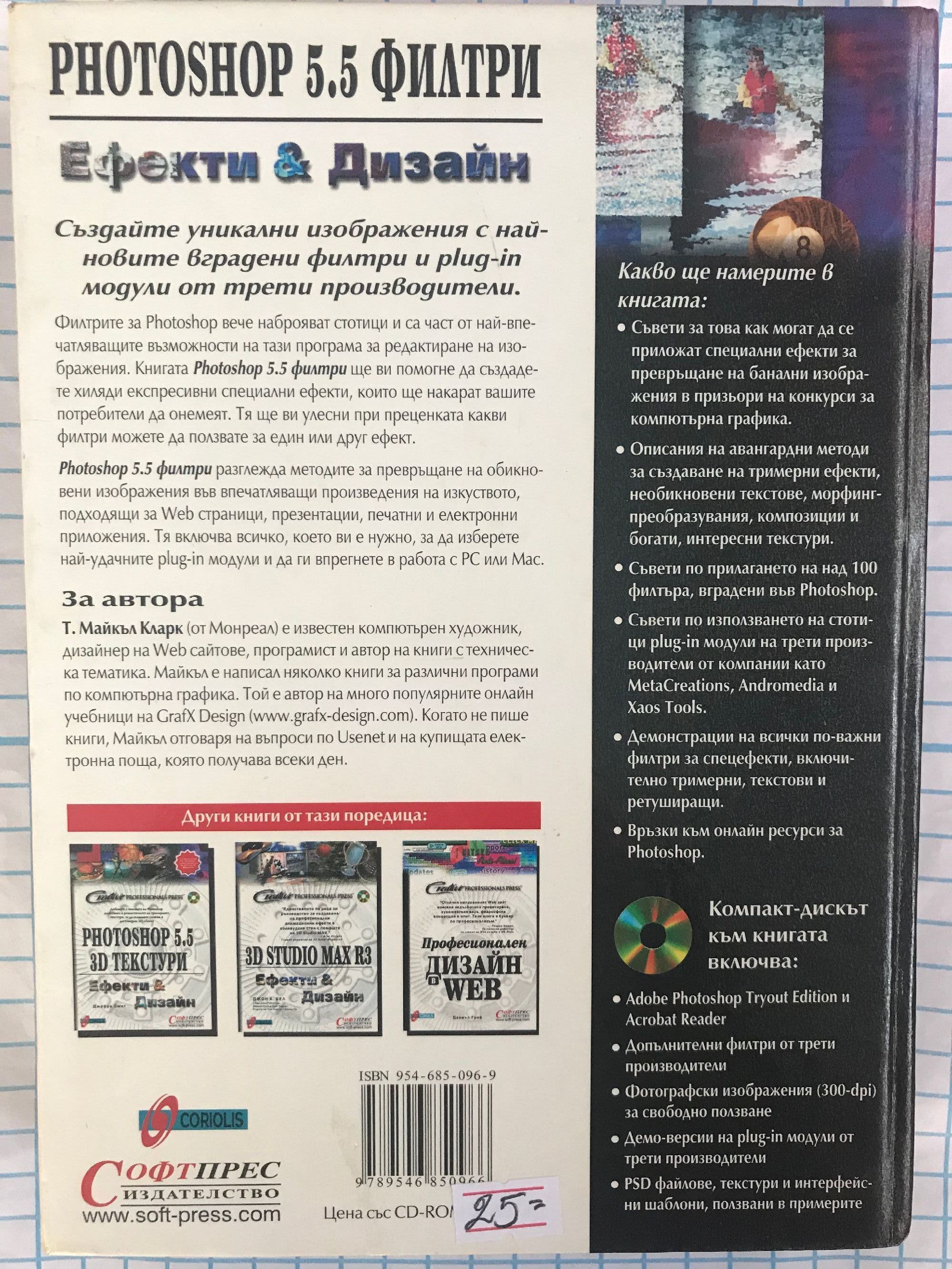 Създайте уникални изображения с най-новите вградени филтри и plug-in модули от трети производители. Филтрите за Photoshop вече наброяват стотици и са част от най-впечатляващите възможности на тази програма за редактиране на изображения. Книгата Photoshop 5.5 филтри ще ви помогне да създадете хиляди експресивни специални ефекти, които ще накарат вашите потребители да онемеят. Тя ще ви улесни при преценката ви какви филтри можете да ползвате за един или друг ефект. Photoshop 5.5 филтри разглежда методите за превръщане на обикновени изображения във впечатляващи произведения на изкуството, подходящи за Web страници, презентации, печатни и електронни приложения. Тя включва всичко, което ви е нужно, за да изберете най-удачните plug-in модули и ги впрегнете в работа с PC или Mac.