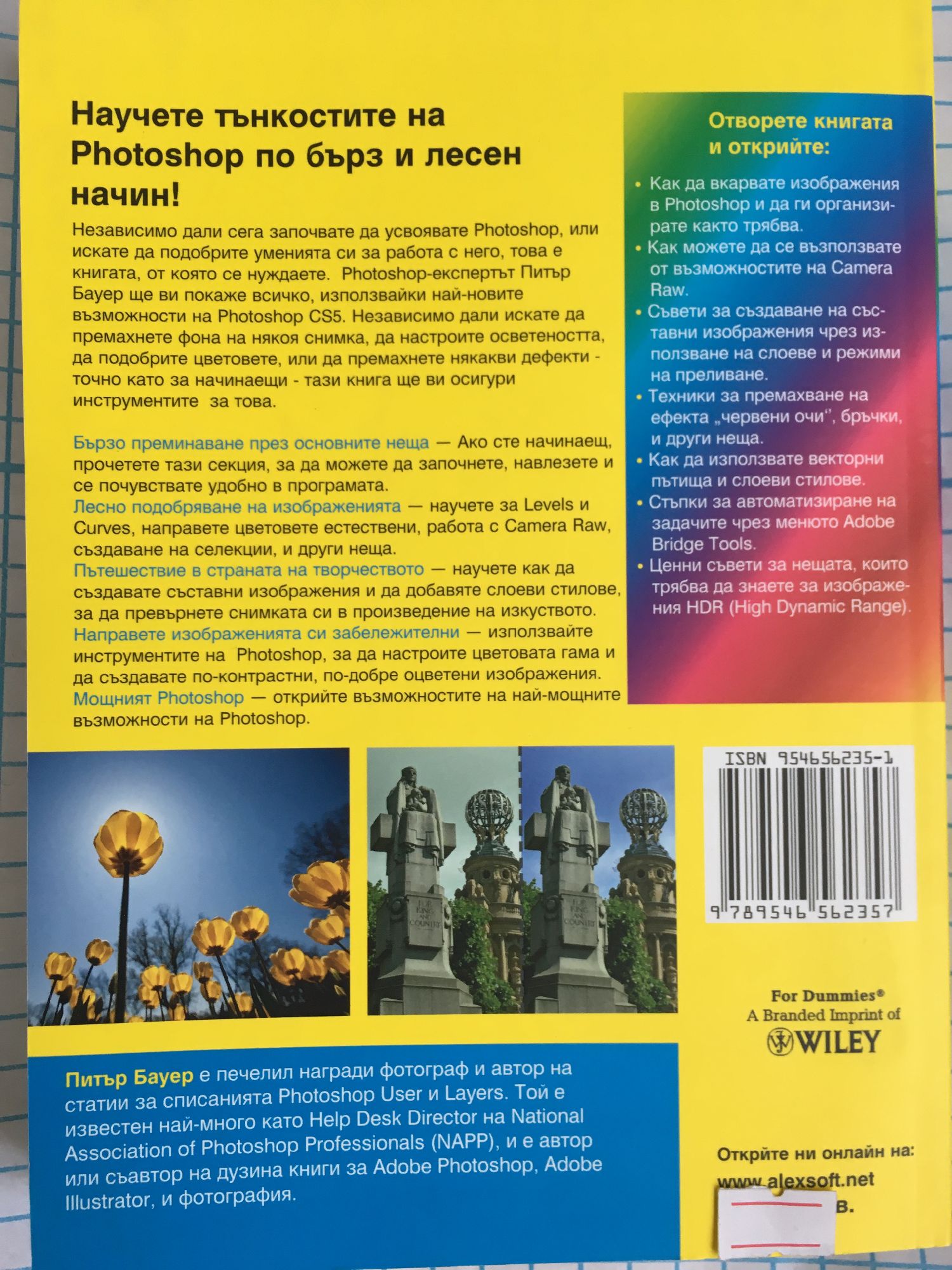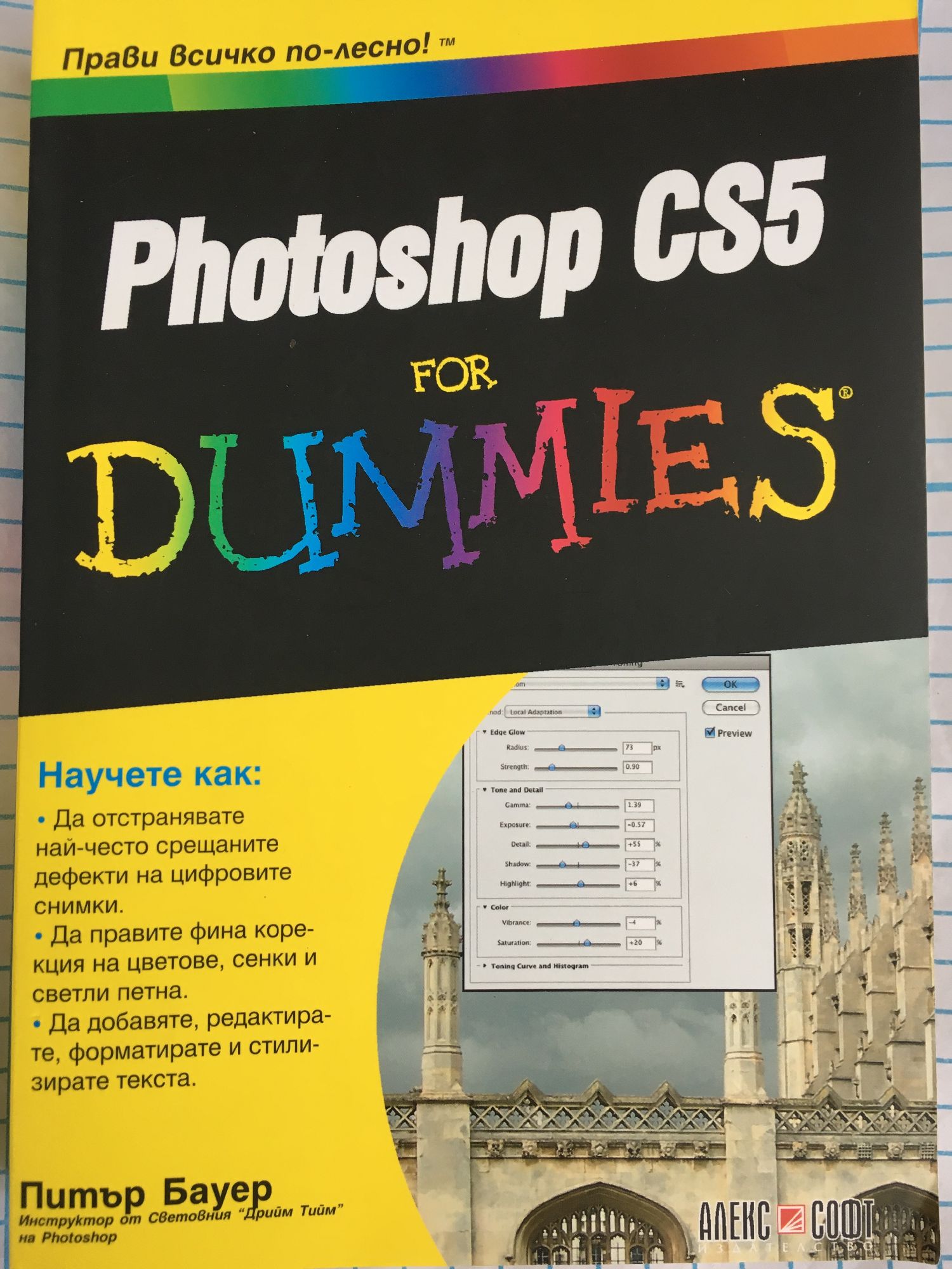 Научете как: * да отстранявате най-често срещаните дефекти на цифровите снимки * да правите фина корекция на цветове, сенки и светли петна * да добавяте, редактирате, форматирате и стилизирате текста Независимо дали сега започвате да усвоявате Photoshop, или искате да подобрите уменията си за работа с него, това е книгата, от която се нуждаете. Photoshop-експертът Питър Бауер ще ви покаже всичко, използвайки най-новите възможности на Photoshop CS5. Независимо дали искате да премахнете фона на някоя снимка, да настроите осветеността, да подобрите цветовете, или да премахнете някакви дефекти - точно като за начинаещи - тази книга ще ви осигури инструментите за това. Бързо преминаване през основните неща: Ако сте начинаещ, прочетете тази секция, за да можете да започнете, навлезете и се почувствате удобно в програмата.Лесно подобряване на изображенията: научете за Levels и Curves, направете цветовете естествени, работа с Camera Raw, създаване на селекции, и други неща. Пътешествие в страната на творчеството: научете как да създавате съставни изображения и да добавяте слоеви стилове, за да превърнете снимката си в произведение на изкуството. Направете изображенията си забележителни: използвайте инструментите на Photoshop, за да настроите цветовата гама и да създавате по-контрастни, по-добре оцветени изображения. Мощният Photoshop: открийте възможностите на най-мощните възможности на Photoshop. Отворете книгата и открийте: * как да вкарвате изображения в Photoshop и да ги организирате както трябва * как можете да се възползвате от възможностите на Camera Raw * съвети за създаване на съставни изображения чрез използване на слоеве и режими на преливане * техники за премахване на ефекта "червени очи", бръчки и други неща * как да използвате векторни пътища и слоеви стилове * стъпки за автоматизиране на задачите чрез менюто Adobe Bridge Tools * ценни съвети за нещата, които трябва да знаете за изображения HDR (High Dynamic Range)