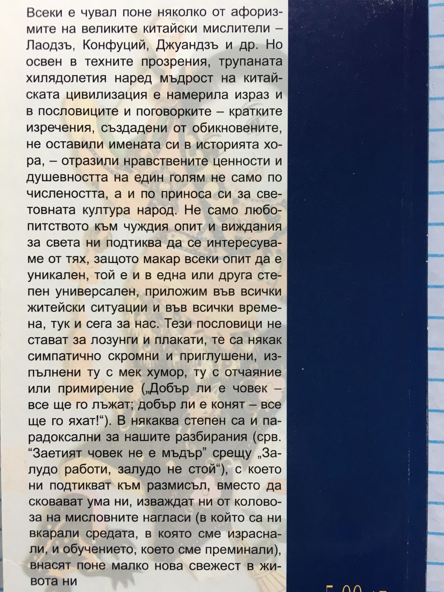 Всеки е чувал поне няколко от афоризмите на великите китайски мислители — Лаодзъ, Конфуций, Джуандзъ и др. Но освен в техните прозрения, трупаната хилядолетия наред мъдрост на китайската цивилизация е намерила израз и в пословиците и поговорките — кратките изречения, създадени от обикновените, не оставили имената си в историята хора, — отразили нравствените ценности и душевността на един голям не само по числеността, а и по приноса си за световната култура народ. Не само любопитството към чуждия опит и виждания за света ни подтиква да се интересуваме от тях, защото макар всеки опит да е уникален, той е и в една или друга степен универсален, приложим във всички житейски ситуации и във всички времена, тук и сега за нас. Тези пословици не стават за лозунги и плакати, те са някак симпатично скромни и приглушени, изпълнени ту с мек хумор, ту с отчаяние или примирение („Добър ли е човек — все ще го лъжат; добър ли е конят — все ще го яхат!“). В някаква степен са и парадоксални за нашите разбирания (срв. „Заетият човек не е мъдър“ срещу „Залудо работи, залудо не стой“), с което ни подтикват към размисъл, вместо да сковават ума ни, изваждат ни от коловоза на мисловните нагласи (в който са ни вкарали средата, в която сме израснали, и обучението, което сме преминали), внасят поне малко нова свежест в живота ни.
