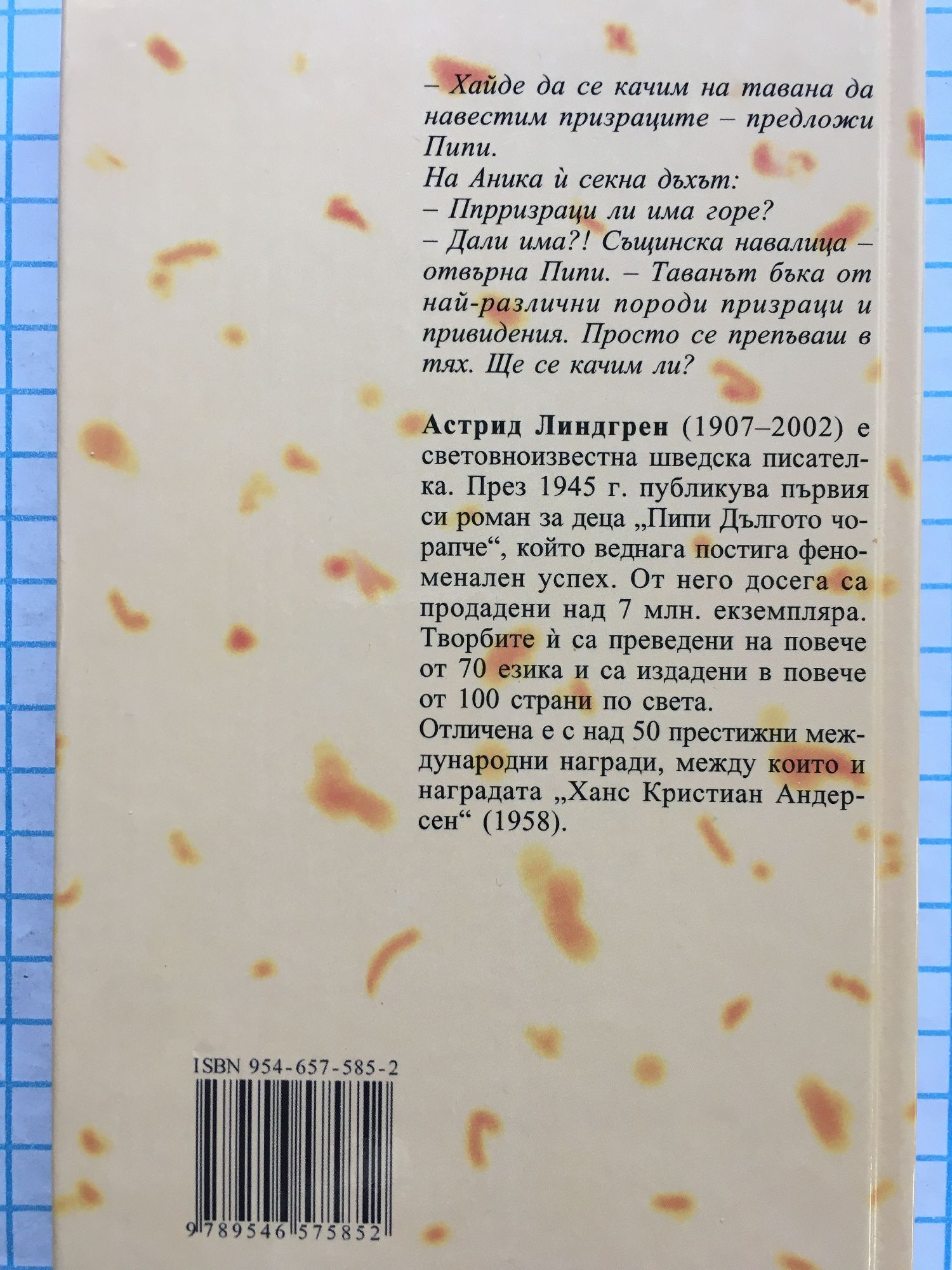 "- Хайде да се качим на тавана да навестим призраците - предложи Пипи. На Аника й секна дъхът: - Ппрризраци ли има горе? - Дали има?! Същинска навалица - отвърна Пипи. - Таванът бъка от най-различни породи призраци и привидения. Просто се препъваш в тях. Ще се качим ли?"