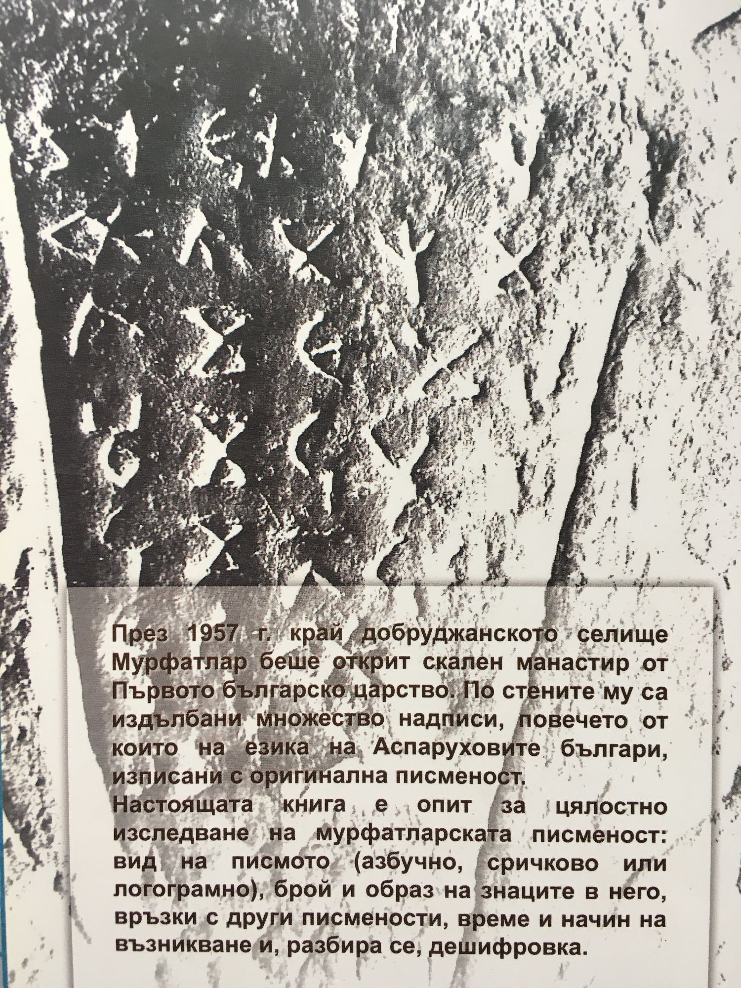 През 1957 г. край добруджанското селище Мурфатлар беше открит скален манастир от Първото българско царство. По стените му са издълбани множество надписи, повечето от които на езика на Аспаруховите българи, изписани с оригинална писменост. Настоящата книга е опит за цялостно изследване на мурфатларскта писменост: вид на писмото (азбучно, сричково или логограмно), брой и образ на знаците в него, връзка с други писмености, врече и начин на възникване, и разбира се, дешифровка.