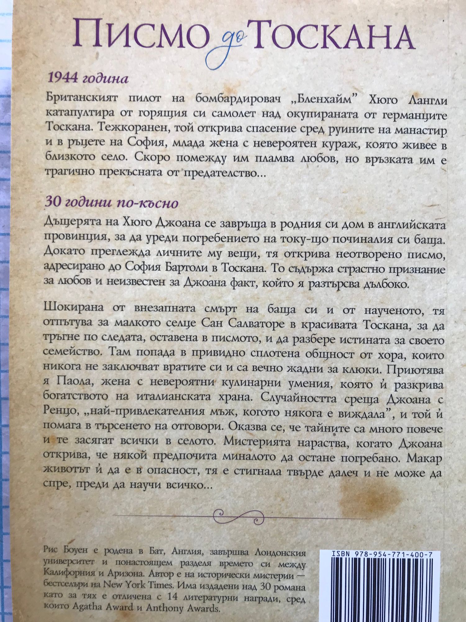 Любовта, предателството и дори дълбоко заровените тайни не могат да останат скрити завинаги 1944 година Британският пилот на бомбардировач „Бленхайм“ Хюго Лангли катапултира от горящия си самолет над окупираната от германците Тоскана. Тежкоранен, той открива спасение сред руините на манастир и в ръцете на София, млада жена с невероятен кураж, която живее в близкото село. Скоро помежду им пламва любов, но връзката им е трагично прекъсната от предателство... 30 години по-късно Дъщерята на Хюго Джоана се завръща в родния си дом в английската провинция, за да уреди погребението на току-що починалия си баща. Докато преглежда личните му вещи, тя открива неотворено писмо, адресирано до София Бартоли в Тоскана. То съдържа страстно признание за любов и неизвестен за Джоана факт, който я разтърсва дълбоко. Шокирана от внезапната смърт на баща си и от наученото, тя отпътува за малкото селце Сан Салваторе в красивата Тоскана, за да тръгне по следата, оставена в писмото, и да разбере истината за своето семейство. Там попада в привидно сплотена общност от хора, които никога не заключват вратите си и са вечно жадни за клюки. Приютява я Паола, жена с невероятни кулинарни умения, която й разкрива богатството на италианската храна. Случайността среща Джоана с Ренцо, „най-привлекателният мъж, когото някога е виждала”, и той й помага в търсенето на отговори. Оказва се, че тайните са много повече и те засягат всички в селото. Мистерията нараства, когато Джоана открива, че някой предпочита миналото да остане погребано. Макар животът й да е в опасност, тя е стигнала твърде далеч и не може да спре, преди да научи всичко...