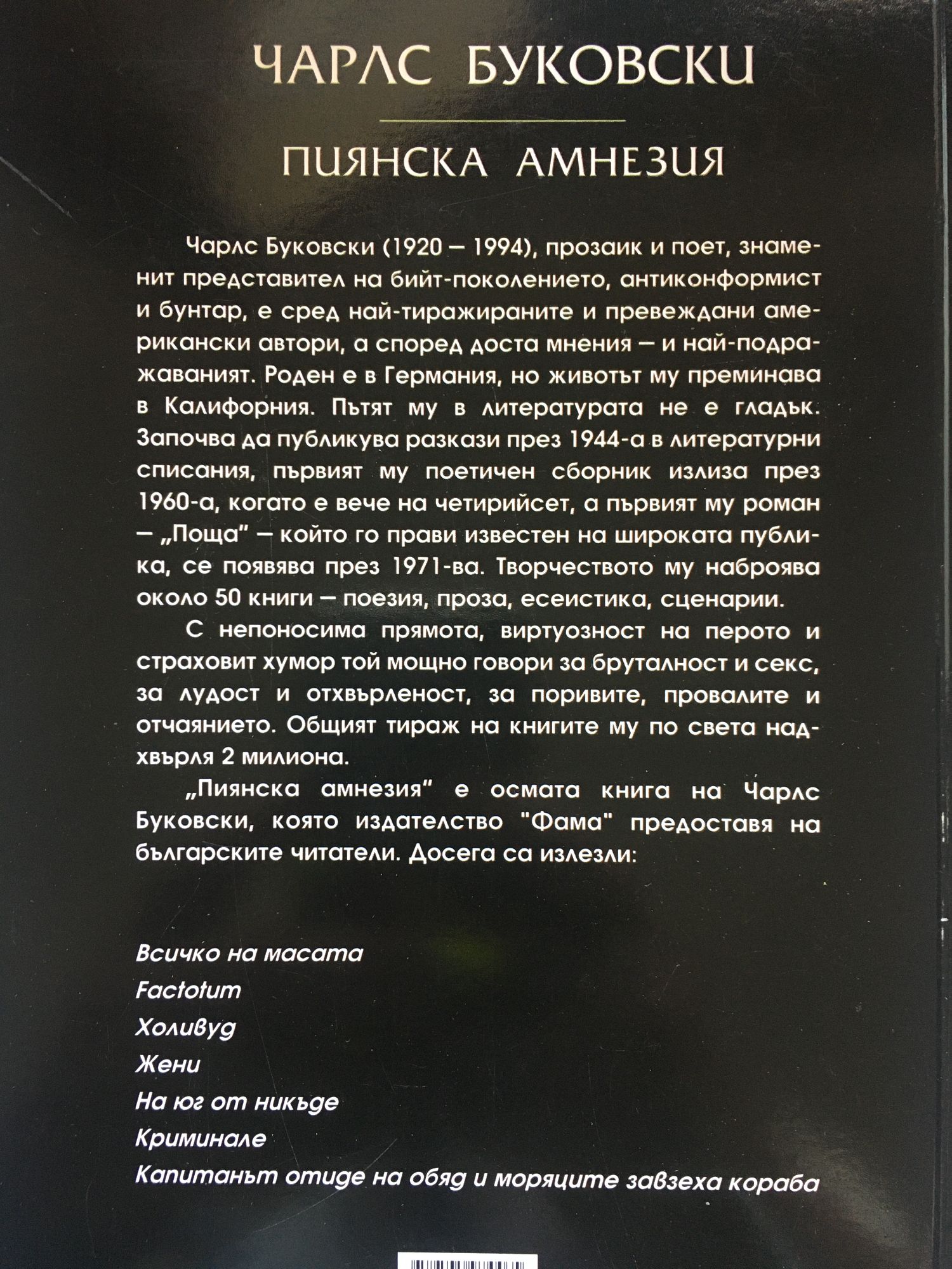 Чарлс Буковски /1920-1994/, прозаик и поет, знаменит представител на бийт-поколението, антиконформист и бунтар, е сред най-тиражираните и превеждани американски автори, а според доста мнения - и най-подражаваният. Роден е в Германия, но животът му преминава в Калифорния. Започва да публикува разкази през 1944 г., първият му поетичен сборник излиза през 1960-а, когато е вече на четирийсет , а първият му роман "Поща" - който го прави известен на широката публика, се появява през 1971-ва. С непоносима прямота, виртуозност на перото и страховит хумор той мощно говори за бруталност и секс, за лудост и отхвърленост, за поривите, провалите и отчаянието. "Пиянска амнезия" е осмата книга на Чарлс Буковски.