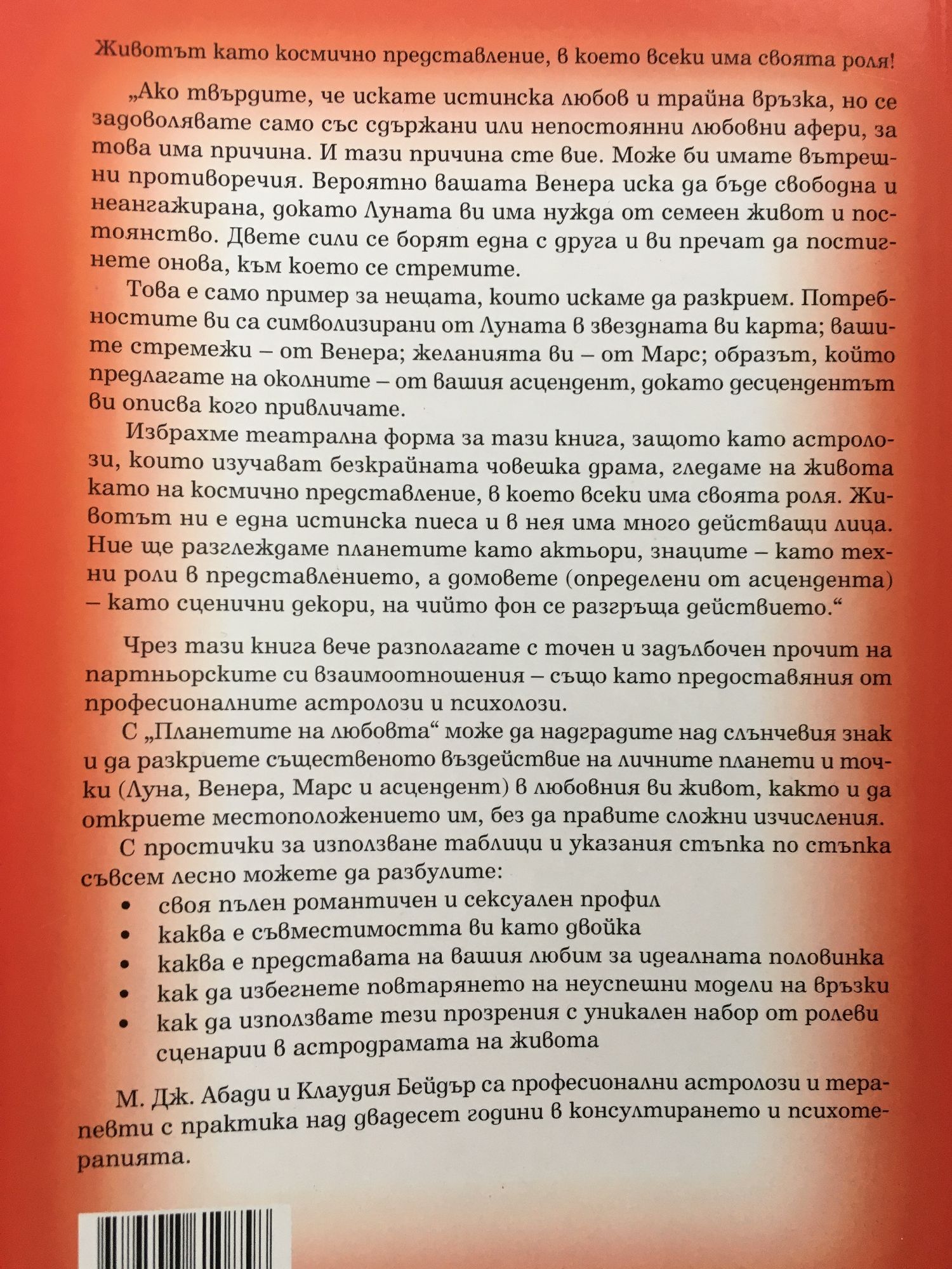 Животът като космично представление, в което всеки има своята роля! „Ако твърдите, че искате истинска любов и трайна връзка, но се задоволявате само със сдържани или непостоянни любовни афери, за това има причина. И тази причина сте вие. Може би имате вътрешни противоречия. Вероятно вашата Венера иска да бъде свободна и неангажирана, докато Луната ви има нужда от семеен живот и постоянство. Двете сили се борят една с друга и ви пречат да постигнете онова, към което се стремите. Това е само пример за нещата, които искаме да разкрием. Потребностите ви са символизирани от Луната в звездната ви карта; вашите стремежи – от Венера; желанията ви – от Марс; образът, който предлагате на околните – от вашия асцендент, докато десцендентът ви описва кого привличате. Избрахме театрална форма за тази книга, защото като астролози, които изучават безкрайната човешка драма, гледаме на живота като на космично представление, в което всеки има своята роля. Животът ни е една истинска пиеса и в нея има много действащи лица. Ние ще разглеждаме планетите като актьори, знаците – като техни роли в представлението, а домовете (определени от асцендента) – като сценични декори, на чийто фон се разгръща действието.” Чрез тази книга вече разполагате с точен и задълбочен прочит на партньорските си взаимоотношения – също като предоставяния от професионалните астролози и психолози. С „Планетите на любовта” може да надградите над слънчевия знак и да разкриете същественото въздействие на личните планети и точки (Луна, Венера, Марс и асцендент) в любовния ви живот, както и да откриете местоположението им, без да правите сложни изчисления. С простички за използване таблици и указания стъпка по стъпка съвсем лесно можете да разбулите: • своя пълен романтичен и сексуален профил (както и на вашия партньор) • каква е съвместимостта ви като двойка • каква е представата на вашия любим за идеалната половинка • как да избегнете повтарянето на неуспешни модели на отношения • как да използвате тези прозрения с уникален набор от ролеви сценарии в астро-драмата на живота Възприемането на тези идеи и всекидневното им прилагане ще ви даде възможност да използвате вродените си сили най-пълно, да промените това, което можете, да приемете онова, което не можете да промените, и да съумеете да доловите разликата между двете. М. Дж. Абади и ??Клаудия Бейдър са професионални астролози и терапевти с практика над двадесет години в консултирането и психотерапията.