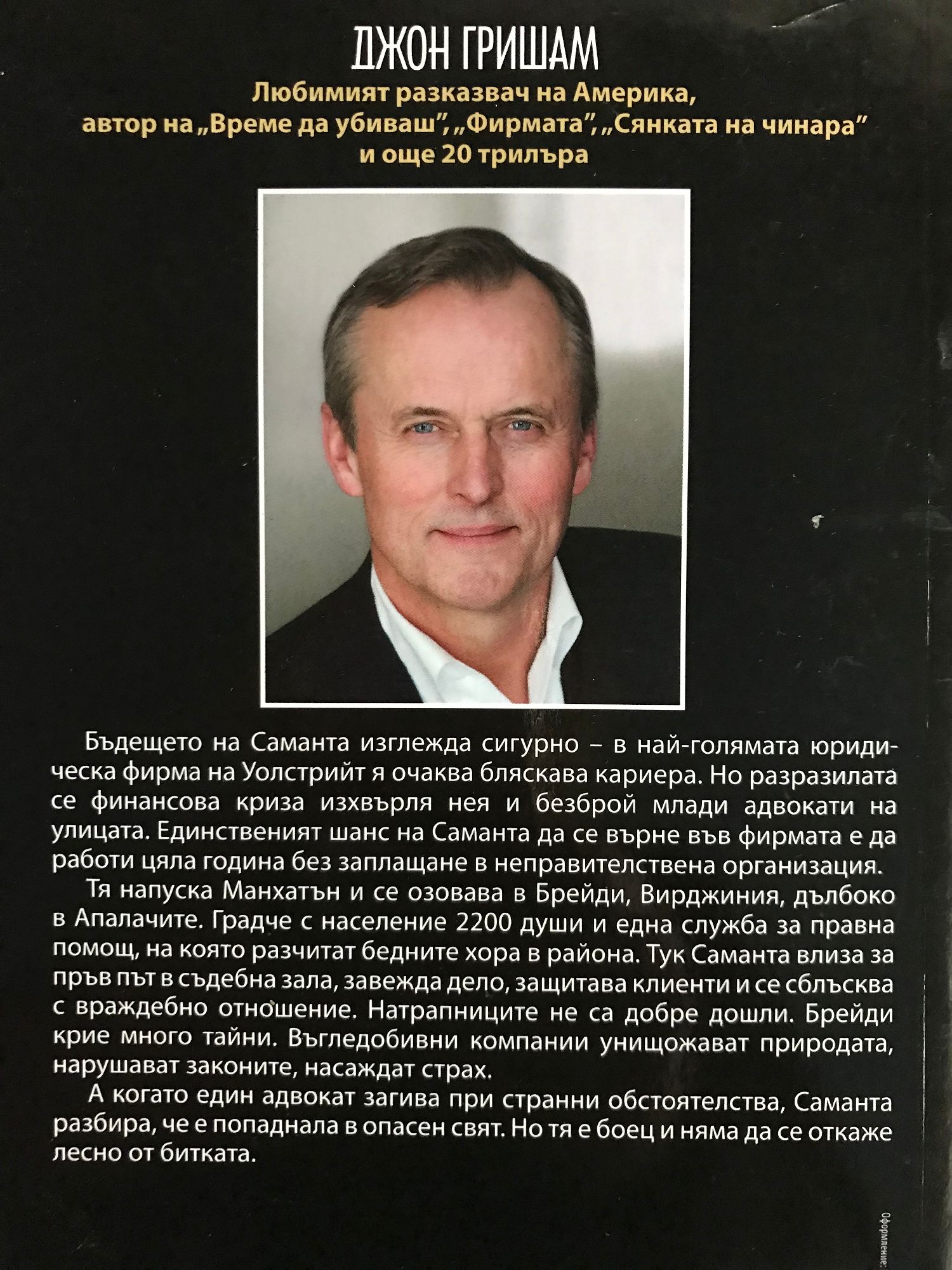 Любимият разказвач на Америка, автор на „Време да убиваш”, „Фирмата”, „Сянката на чинара” и още 20 трилъра. Бъдещето на Саманта изглежда сигурно - в най-голямата юридическа фирма на Уолстрийт я очаква бляскава кариера. Но разразилата се финансова криза изхвърля нея и безброй млади адвокати на улицата. Единственият шанс на Саманта да се върне във фирмата е да работи цяла година без заплащане в неправителствена организация. Тя напуска Манхатън и се озовава в Брейди, Вирджиния, дълбоко в Апалачите. Градче с население 2 200 души и една служба за правна помощ, на която разчитат бедните хора в района. Тук Саманта влиза за пръв път в съдебна зала, завежда дело, защитава клиенти и се сблъсква с враждебно отношение. Натрапниците не са добре дошли. Брейди крие много тайни. Въгледобивни компании унищожават природата, нарушават закони и правилници, насаждат страх. А когато един адвокат загива при странни обстоятелства, Саманта разбира, че е попаднала в опасен свят. Но тя е боец и няма да се откаже лесно от битката.