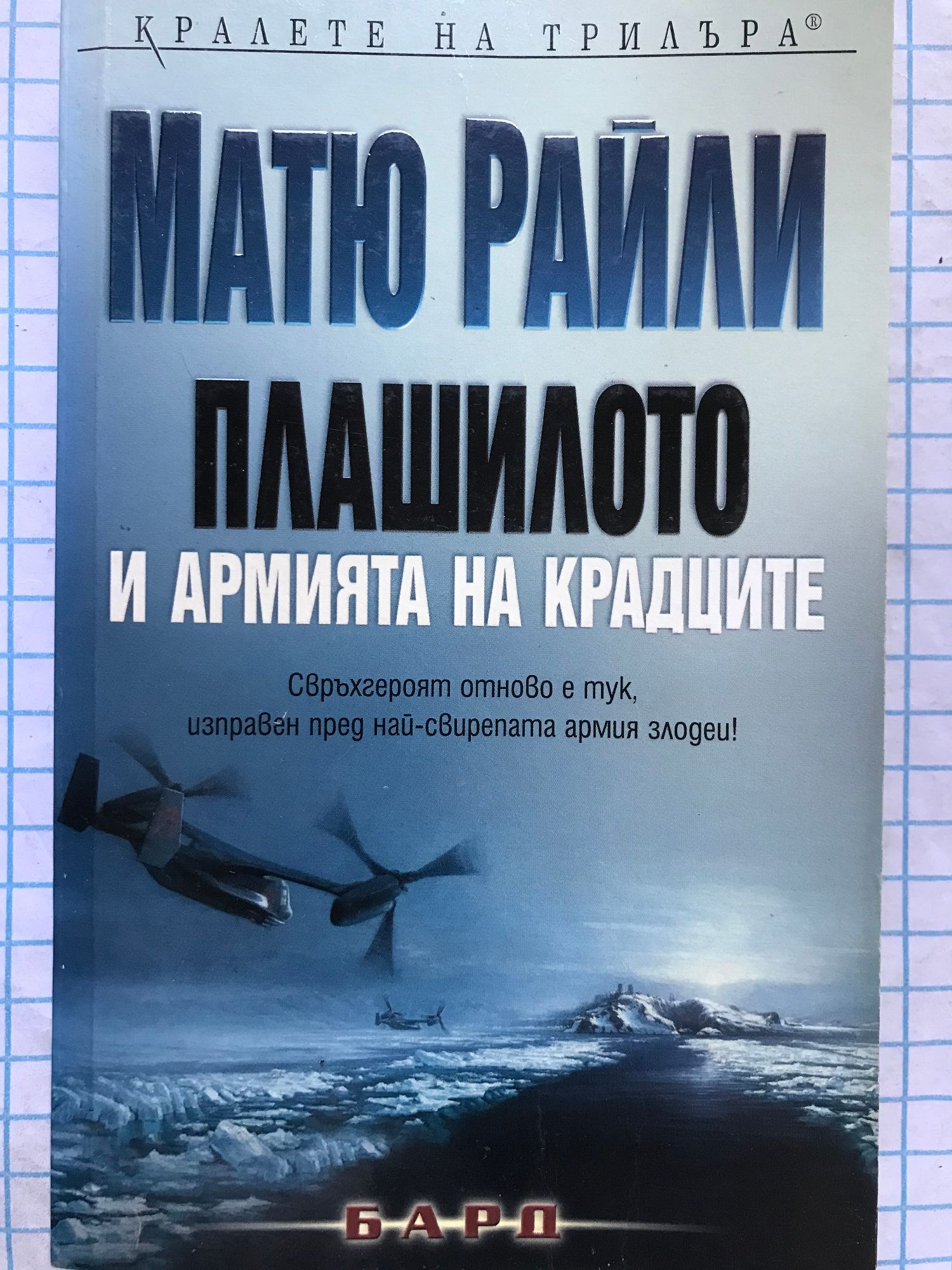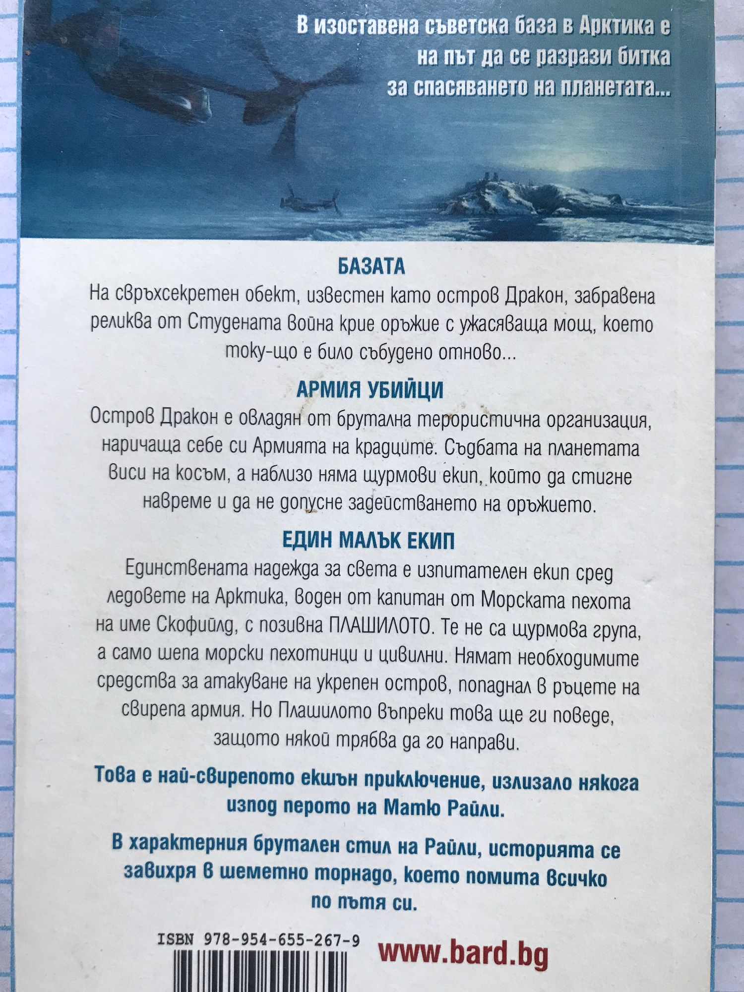Свръхгероят отново е тук, изправен пред най-свирепата армия злодеи! В изоставена съветска база в Арктика е на път да се разрази битка за спасяването на планетата... БАЗАТА На свръхсекретен обект, известен единствено като остров Дракон, забравена реликва от Студената война крие оръжие с ужасяваща мощ, което току-що е било събудено отново... АРМИЯ УБИЙЦИ Остров Дракон е овладян от брутална терористична организация, наричаща себе си Армията на крадците. Съдбата на планетата виси на косъм, а наблизо няма щурмови екип, който да стигне навреме и да не допусне задействането на оръжието. ЕДИН МАЛЪК ЕКИП Единствената надежда за света е изпитателен екип сред ледовете на Арктика, воден от капитан от Морската пехота на име Скофийлд, с позивна ПЛАШИЛОТО. Те не са щурмова група, а само шепа морски пехотинци и цивилни. Нямат необходимите средства, за атакуване на укрепен остров, попаднал в ръцете на свирепа армия. Но Плашилото въпреки това ще ги поведе, защото някой трябва да го направи. Това е най-свирепото екшън приключение, излизало някога изпод перото на Матю Райли. В характерния брутален стил на Райли, историята се завихря в шеметно торнадо, което помита всичко по пътя си.