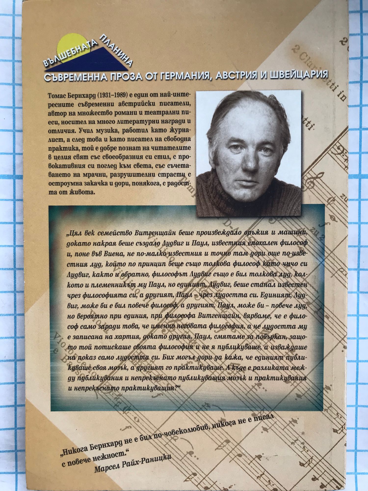Цял век семейство Витгенщайн беше произвеждало оръжия и машини, докато накрая беше създало Лудвиг и Паул, известния и епохален философ и, поне във Виена, не по-малко известния и точно там дори още по-известния луд, който по принцип беше също толкова философ като чичо си Лудвиг, както и обратно, философът Лудвиг също е бил толкова луд, колкото племенникът му Паул, но единият, Лудвиг, беше станал известен чрез философията си, а другият, Паул - чрез лудостта си. Единият, Лудвиг, може би е бил повече философ, а другият, Паул, може би - повече луд, но вероятно при единия, при философа Витгенщайн, вярваме, че е философ само заради това, че именно неговата философия, а не лудостта му е записана на хартия, докато другия, Паул, смятаме за побъркан, защото той потискаше своята философия и не я публикуваше, а изваждаше на показ само лудостта си. Бих могъл дори да кажа, че единия публикуваше своя мозък, а другият го практикуваше. А къде е разликата между публикувания и непрекъснато публикуващия мозък и практикувания и непрекъснато практикуващия?