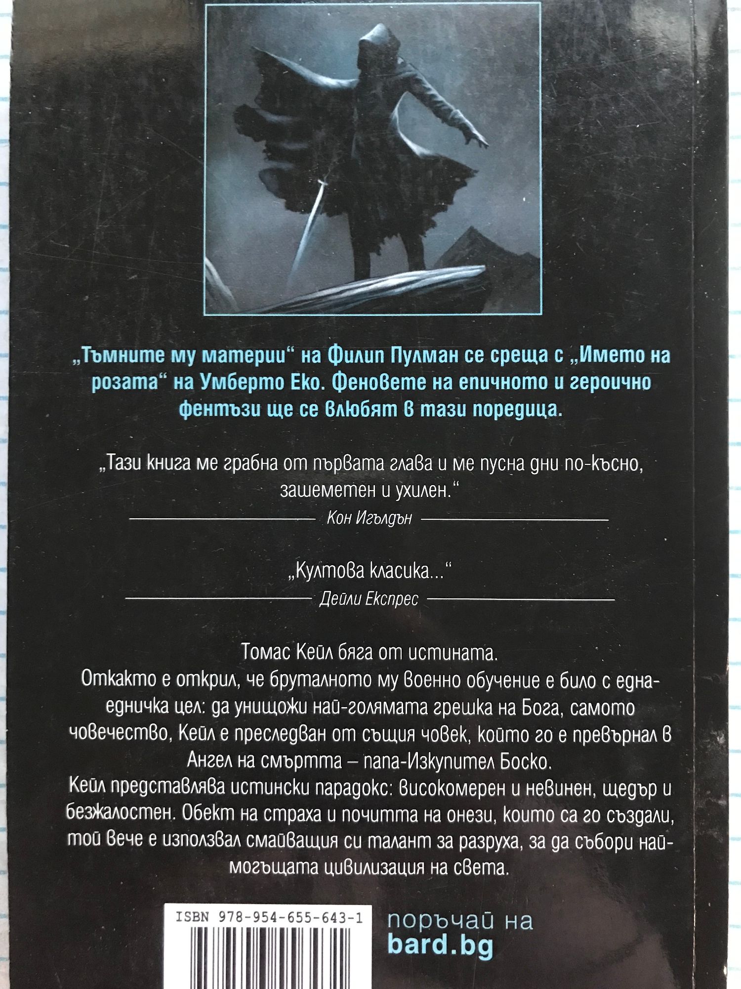 Трета и последна книга от епичната трилогия за Кейл и Светилището на Изкупителите след „Лявата ръка на Бога“ и „Петата погибел“. „Тъмните му материи“ на Филип Пулман се среща с „Името на розата“ на Умберто Еко. Феновете на епичното и героично фентъзи ще се влюбят в тази поредица. „Тази книга ме грабна от първата глава и ме пусна дни по-късно, зашеметен и ухилен.“ Кон Игълдън "Култова класика..." Дейли Експрес Томас Кейл бяга от истината. Откакто е открил, че бруталното му военно обучение е било с една-едничка цел: да унищожи най-голямата грешка на Бога, самото човечество, Кейл е преследван от същия човек, който го е превърнал в Ангел на смъртта – папа-Изкупител Боско. Кейл представлява истински парадокс: високомерен и невинен, щедър и безжалостен. Обект на страха и почитта на онези, които са го създали, той вече е използвал смайващия си талант за разруха, за да събори най-могъщата цивилизация на света.