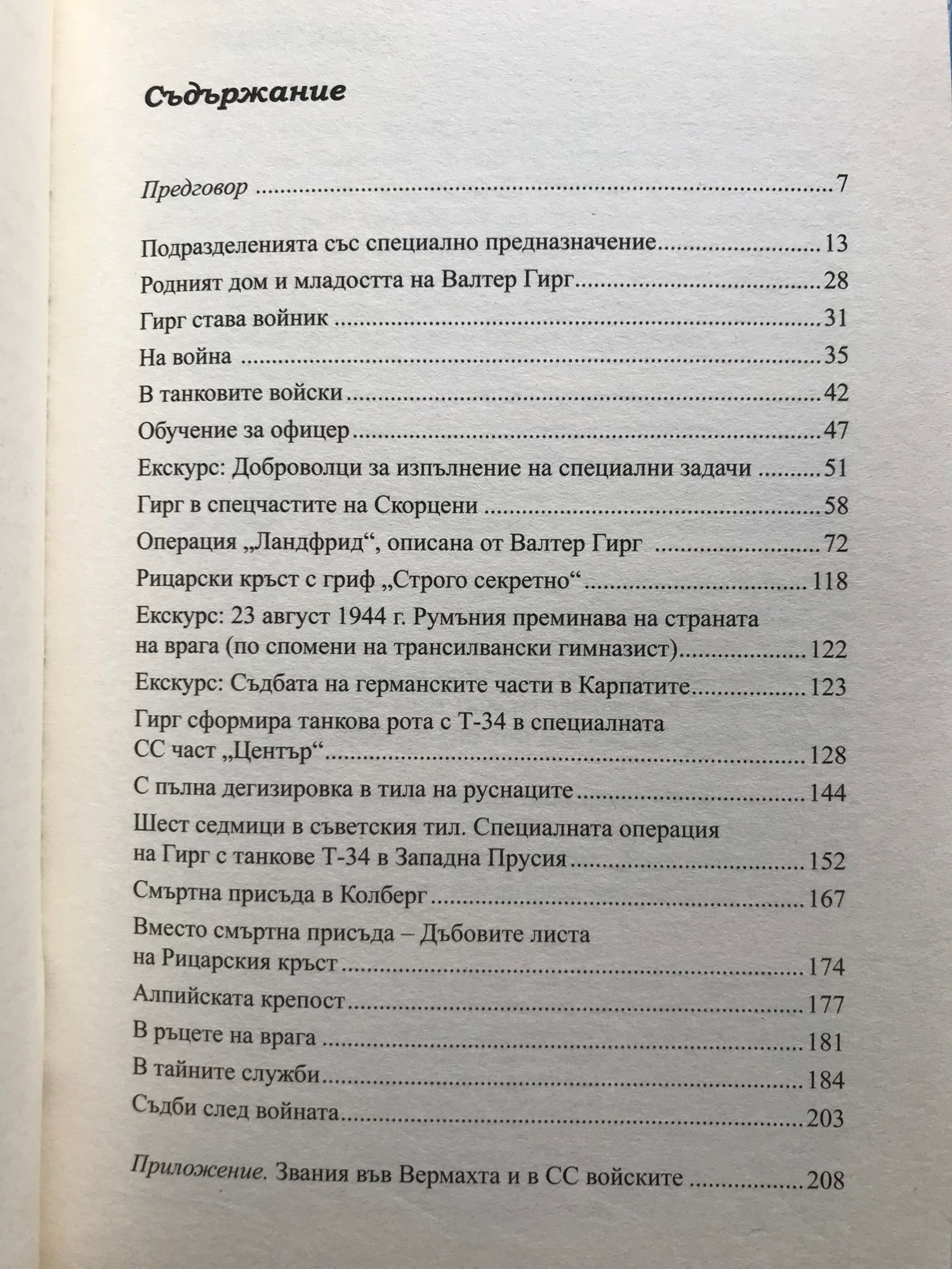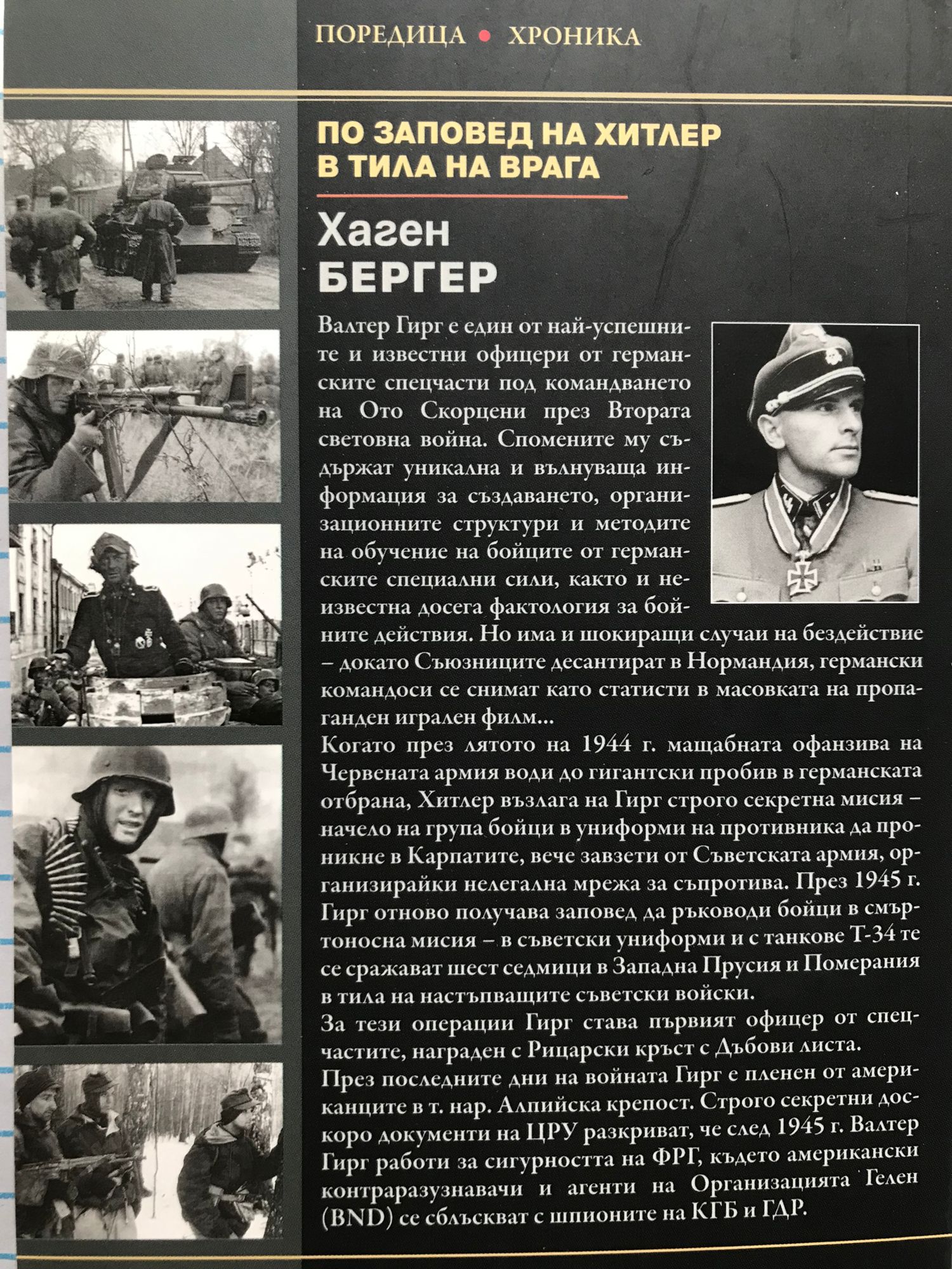 Валтер Гирг е един от най-успешните и известни офицери от германските спецчасти под командването на Ото Скорцени през Втората световна война. Спомените му съдържат уникална и вълнуваща информация за създаването, организационните структури и методите на обучение на бойците от германските специални сили, както и неизвестна досега фактология за бойните действия. Но има и шокиращи случаи на бездействие – докато Съюзниците десантират в Нормандия, германски командоси се снимат като статисти в масовката на пропаганден игрален филм... Когато през лятото на 1944 г. мащабната офанзива на Червената армия води до гигантски пробив в германската отбрана, Хитлер възлага на Гирг строго секретна мисия – начело на група бойци в униформи на противника да проникне в Карпатите, вече завзети от Съветската армия, организирайки нелегална мрежа за съпротива. През 1945 г. Гирг отново получава заповед да ръководи бойци в смъртоносна мисия – в съветски униформи и с танкове Т-34 те се сражават шест седмици в Западна Прусия и Померания в тила на настъпващите съветски войски. За тези операции Гирг става първият офицер от спецчастите, награден с Рицарски кръст с Дъбови листа. През последните дни на войната Гирг е пленен от американците в т. нар. Алпийска крепост. Строго секретни доскоро документи на ЦРУ разкриват, че след 1945 г. Валтер Гирг работи за сигурността на ФРГ, където американски контраразузнавачи и агенти на Организацията Гелен (BND) се сблъскват с шпионите на КГБ и ГДР.