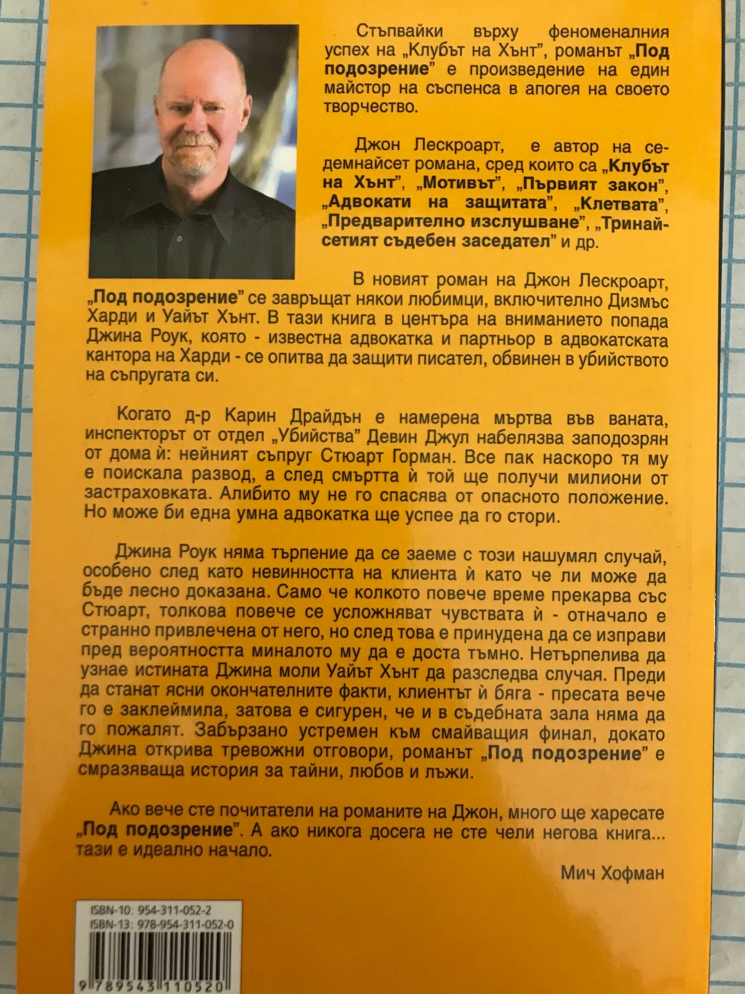 Стъпвайки върху феноменалния успех на "Клубът на Хънт", романът "Под подозрение" е произведение на един майстор на съспенса в апогея на своето творчество. Джон Лескроат, автор на седемнайсет романа, сред които са "Клубът на Хънт", "Мотивът", "Първият закон", "Адвокати на защитата", "Клетвата", "Предварително изслушване", "Тринайсетият съдебен заседател" и др. В новият роман на Джон Лескроарт, "Под подозрение" се завръщат някои любимци, включително Дизмъс Харди и Уайът Хънт. В тази книга в центъра на вниманието попада Джина Роук, която - известна адвокатка и партньор в адвокатската кантора на Харди - се опитва да защити писател, обвинен в убийството на съпругата си. Когато д-р Карин Драйдън е намерена мъртва във ваната, инспекторът от отдел "Убийства" Девин Джул набелязва заподозрян от дома й: нейният съпруг Стюарт Горман. Все пак наскоро тя му е поискала развод, а след смъртта й той ще получи милиони от застраховката. Алибито му не го спасява от опасното положение. Но може би една умна адвокатка ще успее да го стори. Джина Роук няма търпение да се заеме с този нашумял случай, особено след като невинността на клиента й като че ли може да бъде лесно доказана. Само че колкото повече време прекарва със Стюарт, толкова повече се усложняват чувствата й - отначало е странно привлечена от него, но след това е принудена да се изправи пред вероятността миналото му да е доста тъмно. Нетърпелива да узнае истината Джина моли Уайът Хънт да разследва случая. Преди да станат ясни окончателните факти, клиентът й бяга - пресата вече го е заклеймила, затова е сигурен, че и в съдебната зала няма да го пожалят. Забързано устремен към смайващия финал, докато Джина открива тревожни отговори, романът "Под подозрение" е смразяваща история за тайни, любов и лъжи. Ако вече сте почитатели на романите на Джон, много ще харесате "Под подозрение". А ако никога досега не сте чели негова книга... тази е идеално начало. Мич Хофман
