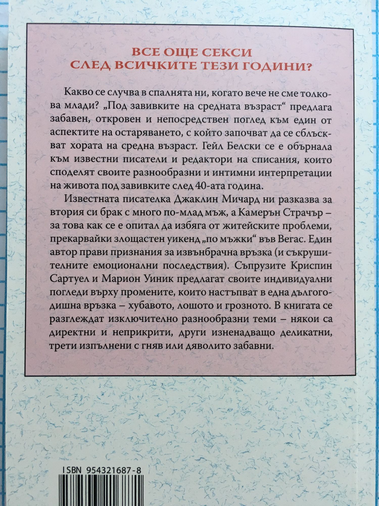 Все още секси -след всичките тези години? Какво се случва в спалнята ни, когато вече не сме толкова млади? „Под завивките на средната възраст“ предлага забавен, откровен и непосредствен поглед към един от аспектите на остаряването, с който започват да се сблъскват хората на средна възраст. Гейл Белски се е обърнала към известни писатели и редактори на списания, които споделят своите разнообразни и интимни интерпретации на живота под завивките след 40-ата година. Известната писателка Джаклин Мичард ни разказва за втория си брак с много по-млад мъж, а Камерън Страчър - за това как се е опитал да избяга от житейските проблеми, прекарвайки злощастен уикенд „по мъжки“ във Вегас. Един автор прави признания за извънбрачна връзка (и съкрушителните емоционални последствия). Съпрузите Криспин Сартуел и Марион Уиник предлагат своите индивидуални погледи върху промените, които настъпват в една дългогодишна връзка - хубавото, лошото и грозното. В книгата се разглеждат изключително разнообразни теми - някои са директни и неприкрити, други изненадващо деликатни, трети изпълнени с гняв или дяволито забавни.