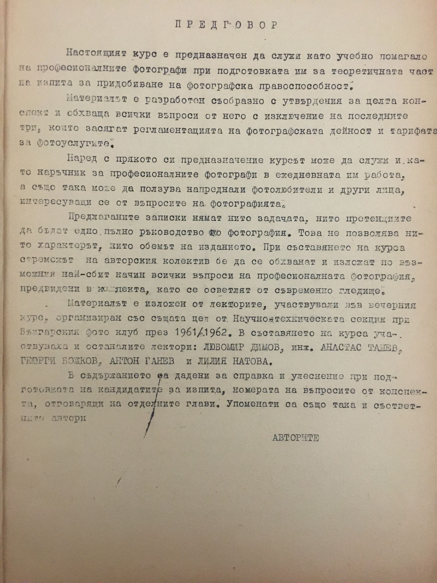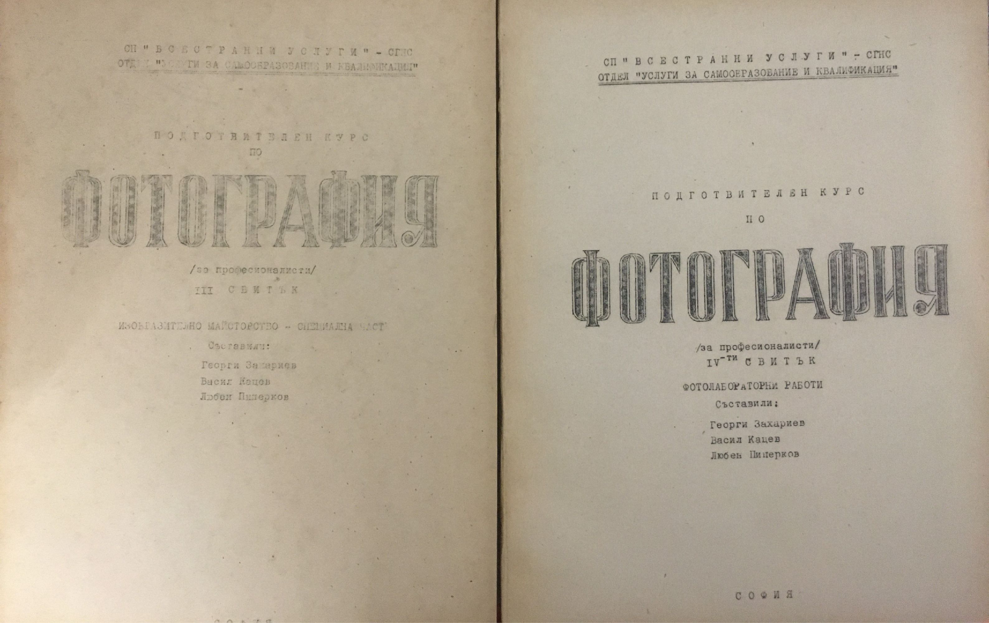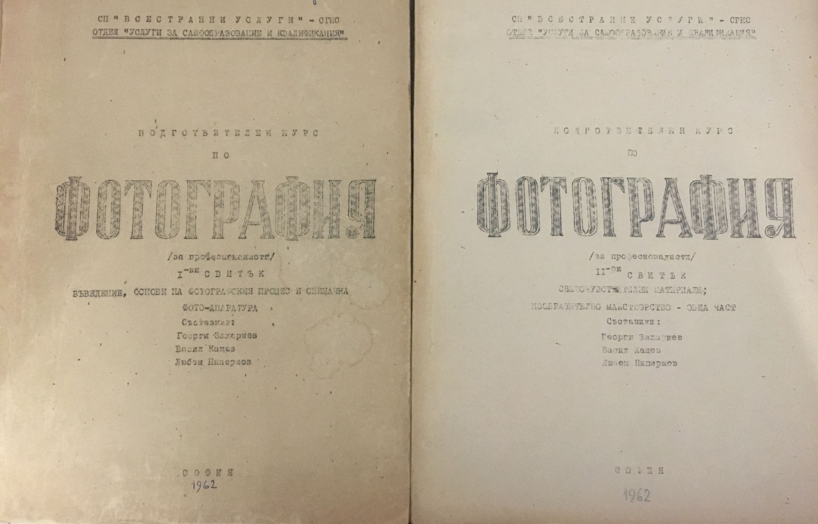 Въведение, основи на фотографския процес и снимачна фото-апаратура. Светочувствителни материали; изобразително майсторство - обща част. Изобразително майсторство - специална част. Фотолабораторни работи. Организация и уредба на фотографски помещения и служби. За професионалисти