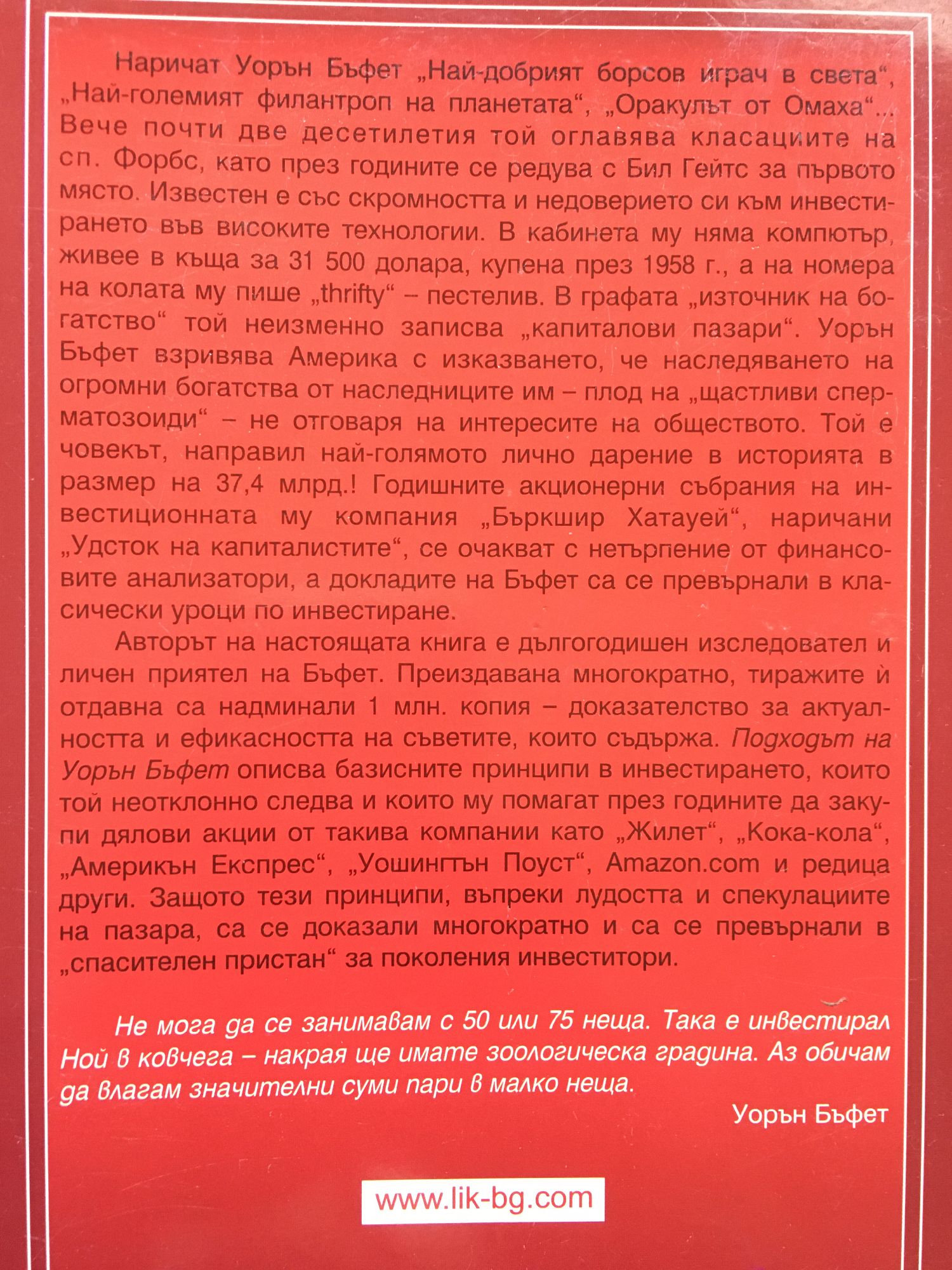 Най-богатият човек на планетата според сп. "Форбес" за 2007 г. Наричат Уорън Бъфет "Най-големият борсов играч на света", "Най-големият филантроп на планетата", "Оракулът на Омаха"... Вече почти две десетилетия той оглавява класациите на сп. Форбс, като през годините се редува с Бил Гейтс за първото място. Известен е със скромността и недоверието си към инвестирането във високите технологии. В кабинета му няма компютър, живее в къща за 31 500 долара, купена през 1958 г., а на номера на колата му пише "thrifty" - пестелив. В графата "източник на богатство" той неизменно записва "капиталови пазари". Уорън Бъфет взривява Америка с изказването, че наследяването на огромни богатства от наследниците им - плод на "щастливи сперматозоиди" - не отговаря на интересите на обществото. Той е човекът, направил най-голямото лично дарение в историята в размер на 37.4 милиарда! Годишните акционерни събрания на инвестиционната му компания "Бъркшир Хатауей", наричани "Удсток на капиталистите", се очакват с нетърпение от финансовите анализатори, а докладите на Бъфет са се превърнали в класически уроци по инвестиране.