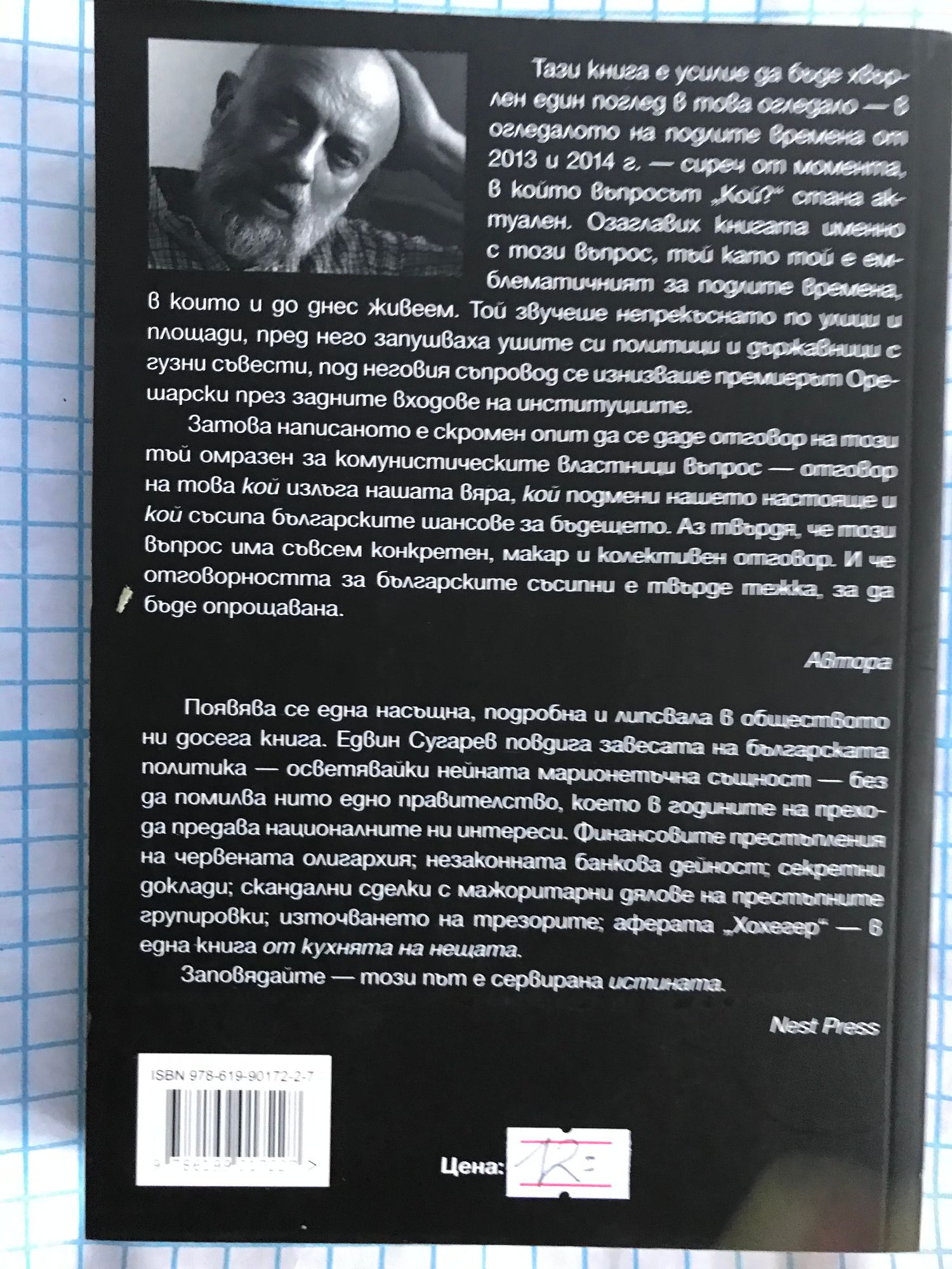 Тази книга е усилие да бъде хвърлен един поглед в това огледало - в огледалото на подлите времена от 2013 и 2014 г. сиреч от момента, в който въпросът "Кой?" стана актуален. Озаглавих книгата именно с този въпрос, тъй като той е емблематичният за подлите времена, в които и до днес живеем. Той звучеше непрекъснато по улици и площади, пред него запушваха ушите си политици и държавници с гузни съвести, под неговия съпровод се изнизваше премиерът Орешарски през задните входове на институциите. Затова написаното е скромен опит да се даде отговор на този тъй омразен за комунистическите властници въпрос - отговор на това кой излъга нашата вяра, кой подмени нашето настояще и кой съсипа българските шансове за бъдещето. Аз твърдя, че този въпрос има съвсем конкретен, макар и колективен отговор. И че отговорността за българските съсипни е твърде тежка, за да бъде опрощавана. /Авторът/