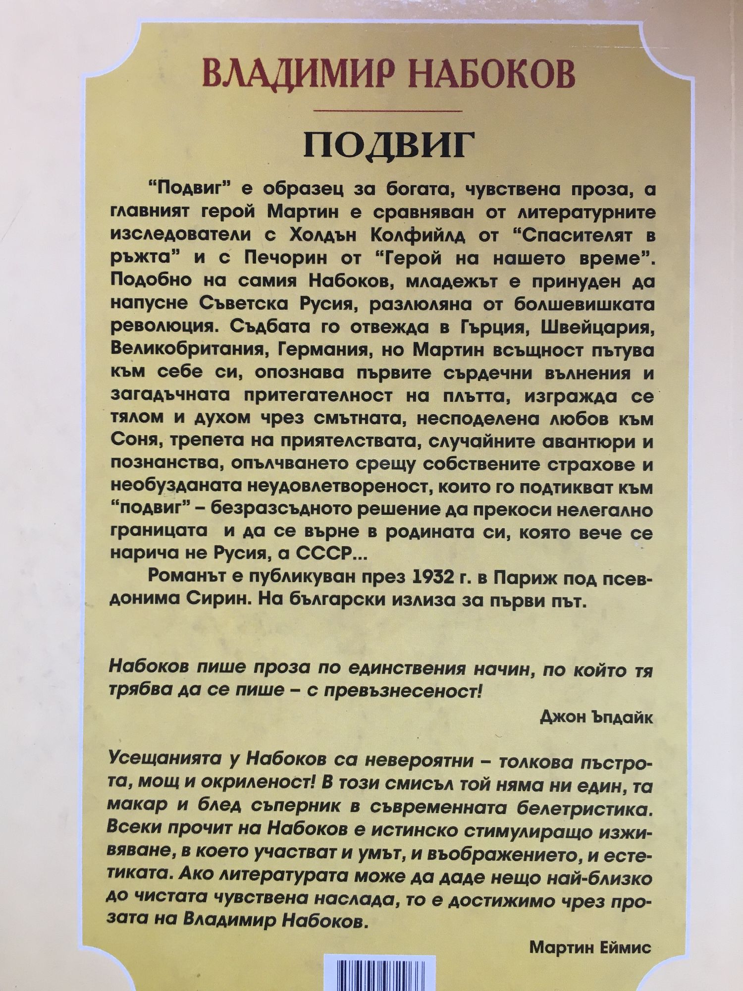 "Подвиг" е образец за богата, чувствена проза, а главният герой Мартин е сравняван от литературните изследователи с Холдън Колфийд от "Спасителят в ръжта" и с Печорин от "Герой на нашето време". Подобно на самия Набоков, младежът е принуден да напусне Съветска Русия, разлюляна от болшевишката революция. Съдбата го отвежда в Гърция, Швейцария, Великобритания, Германия, но Мартин всъщност пътува към себе си, опознава първите сърдечни вълнения и загадъчната притегателност на плътта, изгражда се тялом и духом чрез смътната, несподелена любов към Соня, трепета на приятелствата, случайните авантюри и познанства, опълчването срещу собствените страхове и необузданата неудовлетвореност, които го подтикват към "подвиг" – безразсъдното решение да прекоси нелегално границата и да се върне в родината си, която вече се нарича не Русия, а СССР... Романът е публикуван през 1932 г. в Париж под псевдонима Сирин. На български излиза за първи път. "Набоков пише проза по единствения начин, по който тя трябва да се пише – с превъзнесеност!" Джон Ъпдайк "Усещанията у Набоков са невероятни – толкова пъстрота, мощ и окриленост! В този смисъл той няма ни един, та макар и блед съперник в съвременната белетристика. Всеки прочит на Набоков е истинско стимулиращо изживяване, в което участват и умът, и въображението, и естетиката. Ако литературата може да даде нещо най-близко до чистата чувствена наслада, то е достижимо чрез прозата на Владимир Набоков."