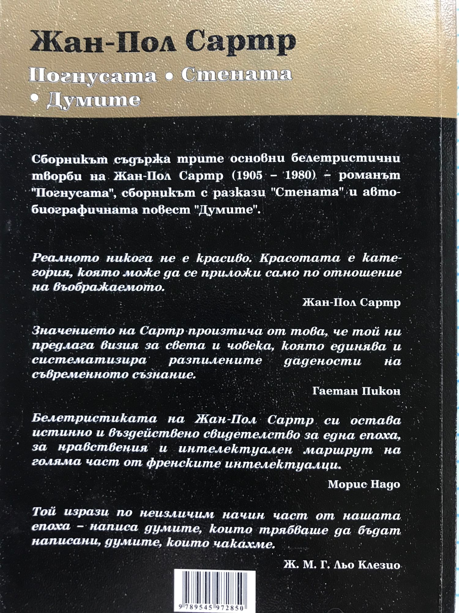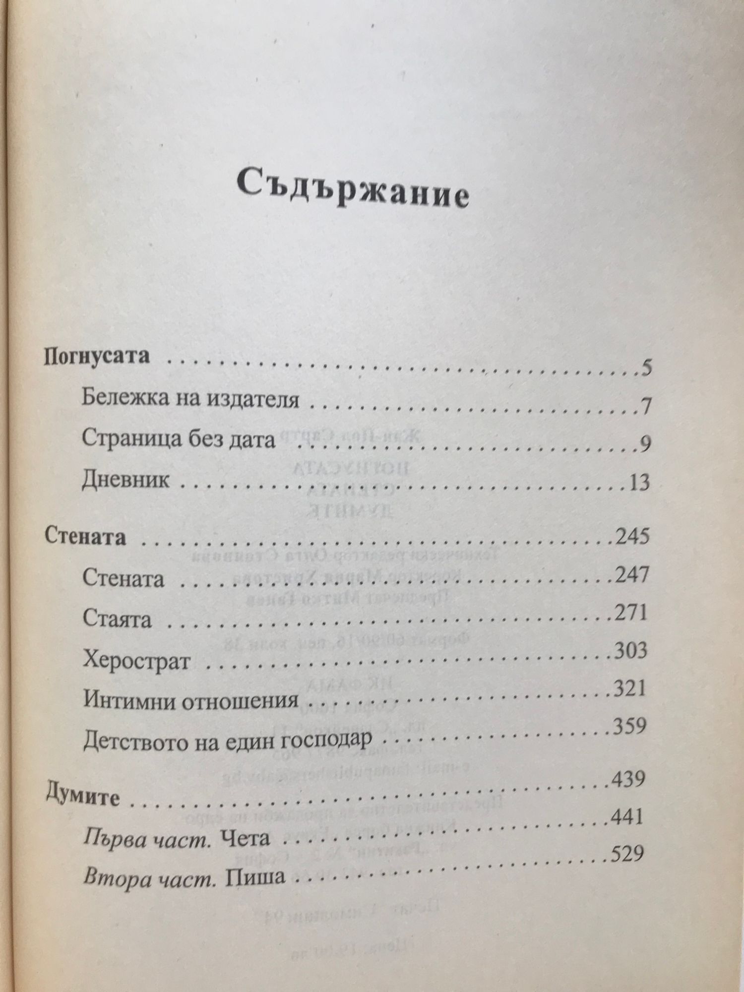Сборникът съдържа трите основни белетристични творби на Жан-Пол Сартр (1905-1980) - романът "Погнусата", сборникът с разкази "Стената" и автобиографичната повест "Думите".