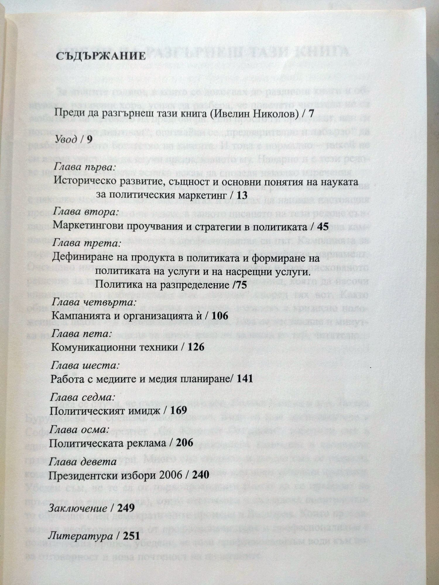 В книгата са събрани много исторически факти, много теоретични постулати, дефиниции и разработки, но най-важното е, че в нея има много конкретен практически опит от реалното правене на политика и примери за успешни и не дотам успешни дейности на политическия маркетинг. Тези страници със сигурност ще са полезни на стотици специалисти, които искат да се усъвършенстват в приложното правене на публични политики или да подобрят участието си в политическия процес. Убедени сме, че книгата, която държите в ръцете си, ще увеличи знания ви за онова охулвано, но толкова необходимо и незаменимо нещо, което държи в цялост съвместното ни живеене на Земята – политиката.
