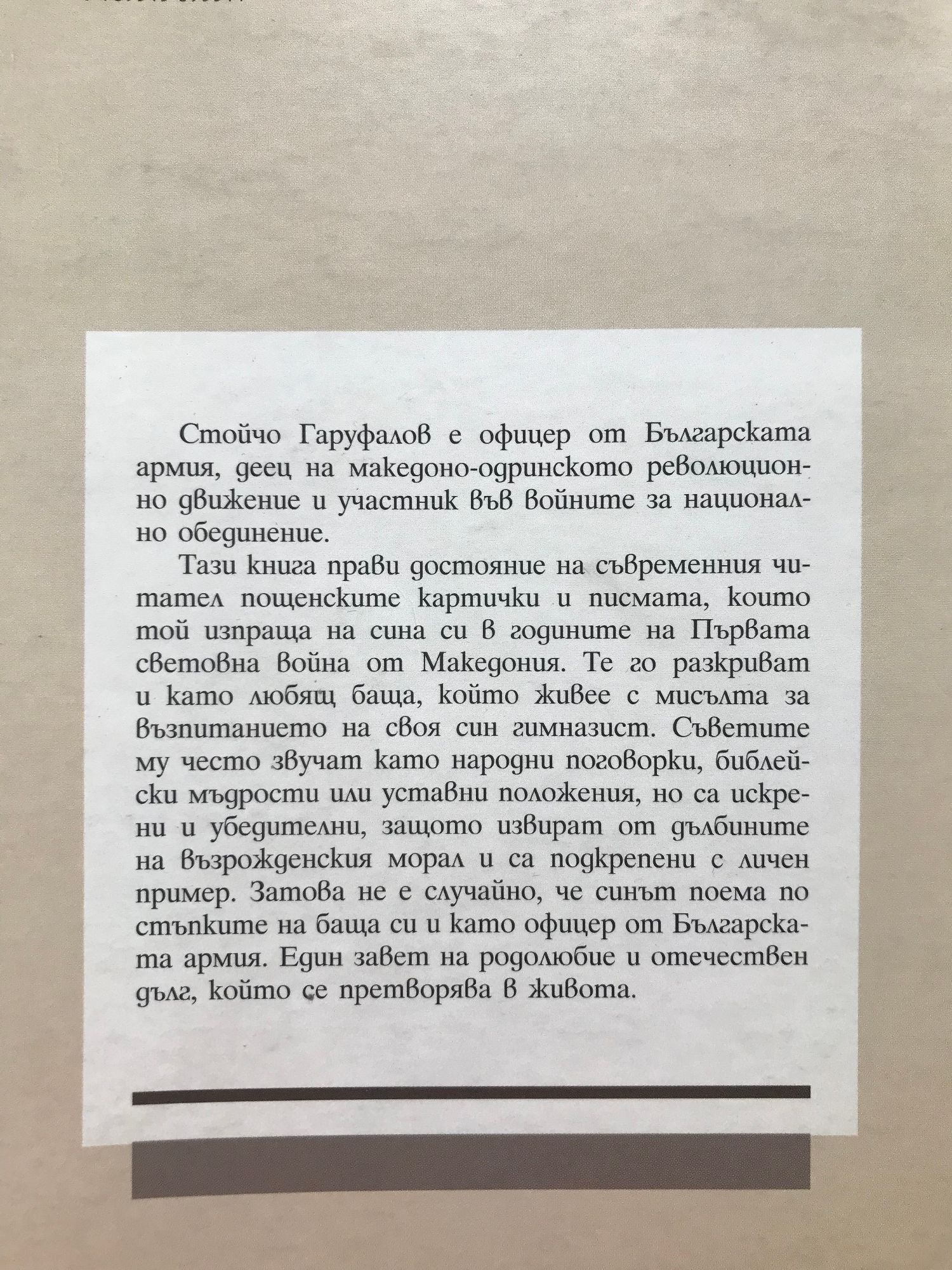 Книгата прави достояние пощенските картички и писмата на офицера Гаруфалов от годините на Първата световна война в Македония. Те го разкриват като любящ баща, който живее с мисълта за възпитанието на своя син. Съветите му често звучат като народни поговорки, библейски мъдрости или уставни положения, но са искрени, защото извират от дълбините на възрожденския морал. Затова не е случайно, че синът също става офицер. Един завет на отечествен дълг, който се претворява в живота.