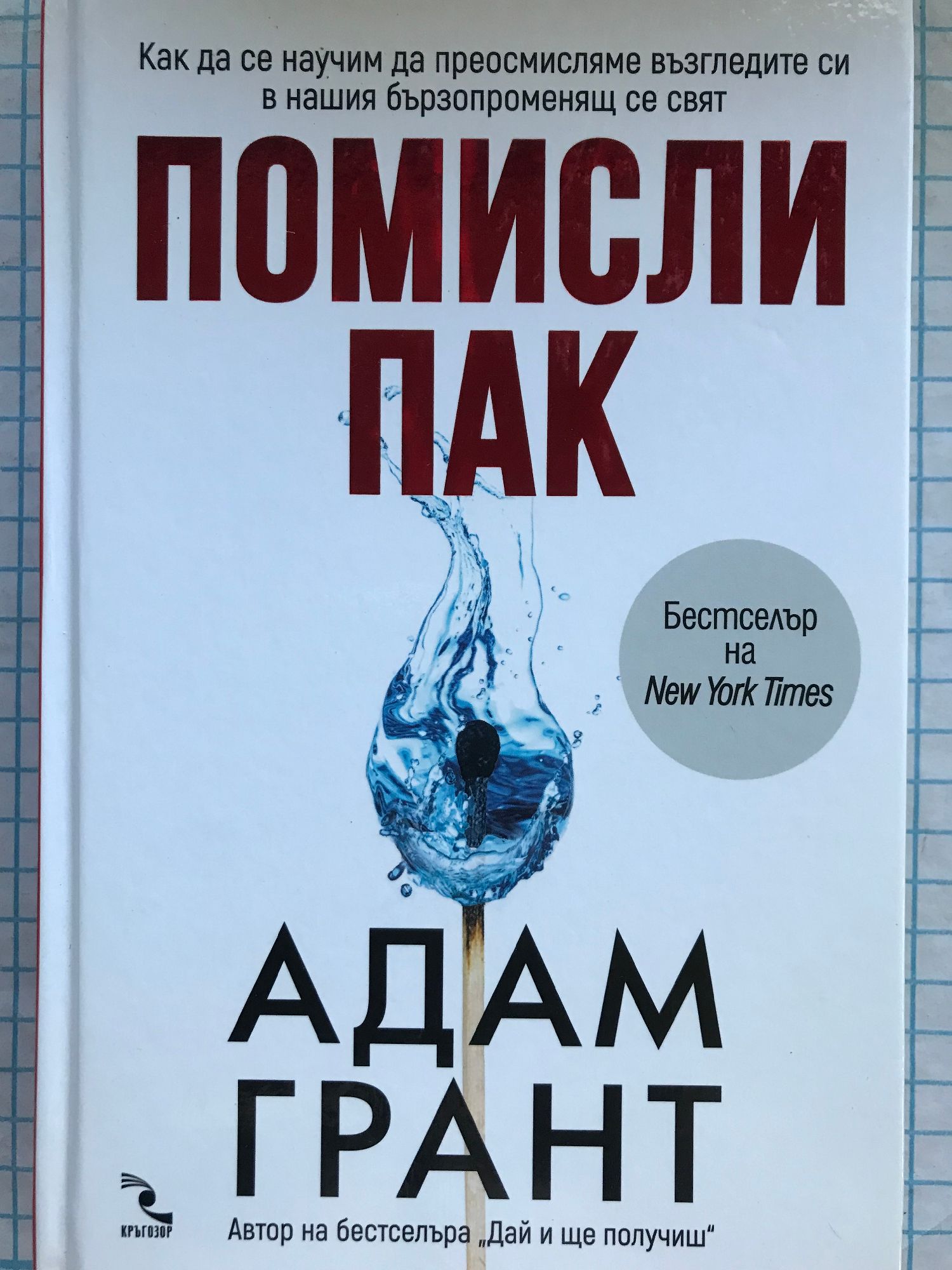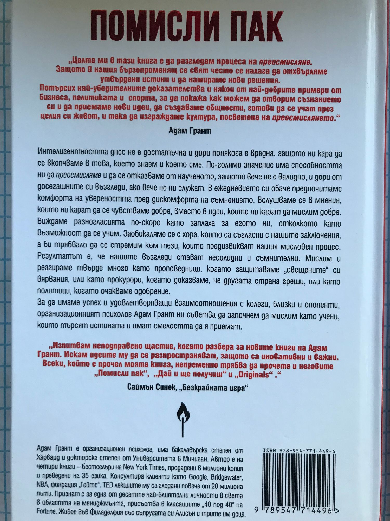 „Целта ми в тази книга е да разгледам процеса на преосмисляне. Защото в нашия бързопроменящ се свят често се налага да отхвърляме утвърдени истини и да намираме нови решения. Потърсих най-убедителните до-казателства и някои от най-добрите примери от бизнеса, политиката и спорта, за да покажа как можем да отворим съзнанието си и да приемаме нови идеи, да създаваме общности, готови да се учат през целия си живот, и така да изграждаме култура, посветена на преосмислянето.“ Адам Грант Интелигентността днес не е достатъчна и дори понякога е вредна, защото ни кара да се вкопчваме в това, което знаем и което сме. По-голямо значение има способността ни да преосмисляме и да се отказваме от наученото, защото вече не е валидно, и дори от досегашните си възгледи, ако вече не ни служат. В ежедневието си обаче предпочитаме комфорта на увереността пред дискомфорта на съмнението. Вслушваме се в мнения, които ни карат да се чувстваме добре, вместо в идеи, които ни карат да мислим добре. Виждаме разногласията по-скоро като заплаха за егото ни, отколкото като възможност да се учим. Заобикаляме се с хора, които са съгласни с нашите заключения, а би трябвало да се стремим към тези, които предизвикват нашия мисловен процес. Резултатът е, че нашите възгледи стават несолидни и съмнителни. Мислим и реагираме твърде много като проповедници, когато защитаваме „свещените“ си вярвания, или като прокурори, когато доказваме, че другата страна греши, или като политици, когато очакваме одобрение. За да имаме успех и удовлетворяващи взаимоотношения с колеги, близки и опоненти, организационният психолог А. Грант ни съветва да започнем да мислим като учени, които търсят истината и имат смелостта да я приемат. „Изпитвам неподправено щастие, когато разбера за новите книги на Адам Грант. Искам идеите му да се разпространяват, защото са иновативни и важни. Всеки, който е прочел моята книга, непременно трябва да прочете и неговите „Помисли пак“, „Дай и ще получиш“ и „Originals“. “ Саймън Синек, „Безкрайната игра“ Адам Грант е организационен психолог, има бакалавърска степен от Харвард и докторска степен от Университета в Мичиган. Автор е на четири книги – бестселъри на New York Times, продадени в милиони копия и преведени на 35 езика. Консултира клиенти като Google, NBA, Bridgewater, фондация „Гейтс“. TED лекциите му са гледани повече от 20 милиона пъти. Признат е за една от десетте най-влиятелни личности в света в областта на мениджмънта, присъства в класациите „40 под 40“ на Fortune. Живее във Филаделфия със съпругата си Алисън и трите им деца.