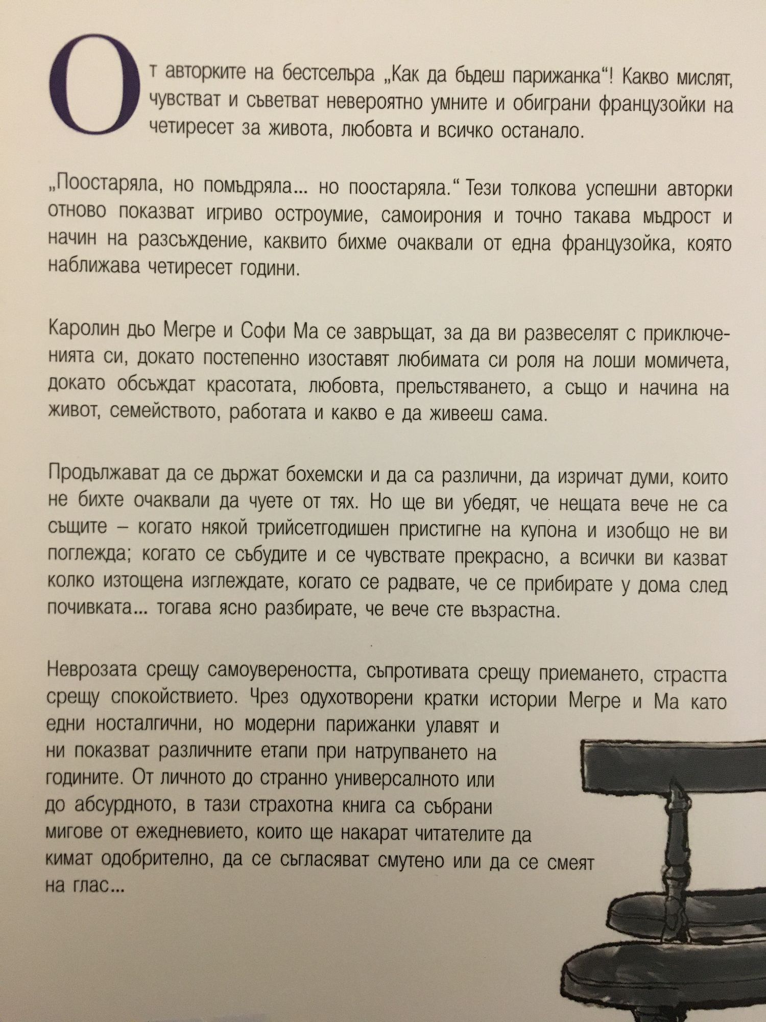 "Поостаряла, но помъдряла… но поостаряла". Тези толкова успешни авторки отново показват игриво остроумие, самоирония и точно такава мъдрост и начин на разсъждение, каквито бихме очаквали от една французойка, която наближава четиресет години. Каролин дьо Мегре и Софи Ма се завръщат, за да ви развеселят с приключенията си, докато постепенно изоставят любимата си роля на лоши момичета, докато обсъждат красотата, любовта, прелъстяването, а също и начина на живот, семейството, работата и какво е да живееш сама. Продължават да се държат бохемски и да са различни, да изричат думи, които не бихте очаквали да чуете от тях. Но ще ви убедят, че нещата вече не са същите - когато някой трийсетгодишен пристигне на купона и изобщо не ви поглежда; когато се събудите и се чувствате прекрасно, а всички ви казват колко изтощена изглеждате, когато се радвате, че се прибирате у дома след почивката... тогава ясно разбирате, че вече сте възрастна. Неврозата срещу самоувереността, съпротивата срещу приемането, страстта срещу спокойствието. Чрез одухотворени кратки истории Мегре и Ма като едни носталгични, но модерни парижанки улавят и ни показват различните етапи при натрупването на годините. От личното до странно универсалното или до абсурдното, в тази страхотна книга са събрани мигове от ежедневието, които ще накарат читателите да кимат одобрително, да се съгласяват смутено или да се смеят на глас... "Поостаряла, но помъдряла, но поостаряла" е духовит поглед към съзряването; представя ни подхода на парижанката към възрастта." Ела Аликзандър, Harper's Bazaar "Поостаряла, но помъдряла, но поостаряла" е книга, която се чете на един дъх за една вечер, а после я купувате и на приятелките си. Подправена с вдъхновяващи цитати и забавни анекдоти, тя е откровен разказ с намигване и молитва." Лора Бейли, Vogue UK