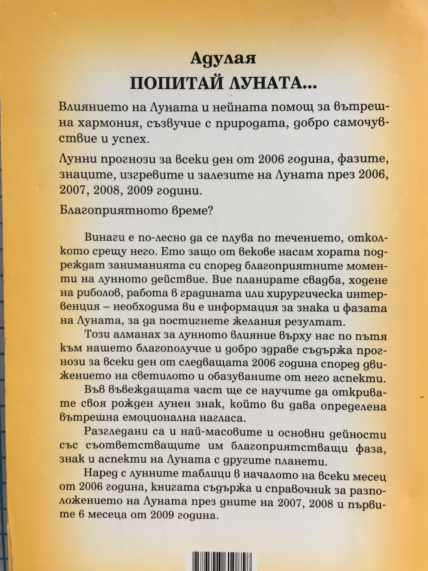 Влиянието на Луната и нейната помощ за Вътрешна хармония, съзвучие с природата, добро самочувствие и успех. Лунни прогнози за всеки ден от 2006 година, фазите, знаците, изгревите и залезите на Луната през 2006, 2007, 2008, 2009 години. Благоприятното време? Винаги е по-лесно да се плува по течението, отколкото срещу него. Ето защо от векове насам хората подреждат заниманията си според благоприятните моменти на лунното действие. Вие планирате свадба, ходене на риболов, работа в градината или хирургическа интервенция - необходима Ви е информация за знака и фазата на Луната, за да постигнете желания резултат. Този алманах за лунното влияние върху нас по пътя към нашето благополучие и добро здраве съдържа прогнози за всеки ден от следващата 2006 година според движението на светилото и образуваните от него аспекти. Във въвеждащата част ще се научите да откривате своя рожден лунен знак, който ви дава определена вътрешна емоционална нагласа. Разгледани са и най-масовите и основни дейности със съответстващите им благоприятстващи фаза, знак и аспекти на Луната с другите планети. Наред с лунните таблици в началото на всеки месец от 2006 година, книгата съдържа и справочник за разположението на Луната през дните на 2007, 2008 и първите 6 месеца от 2009 година.