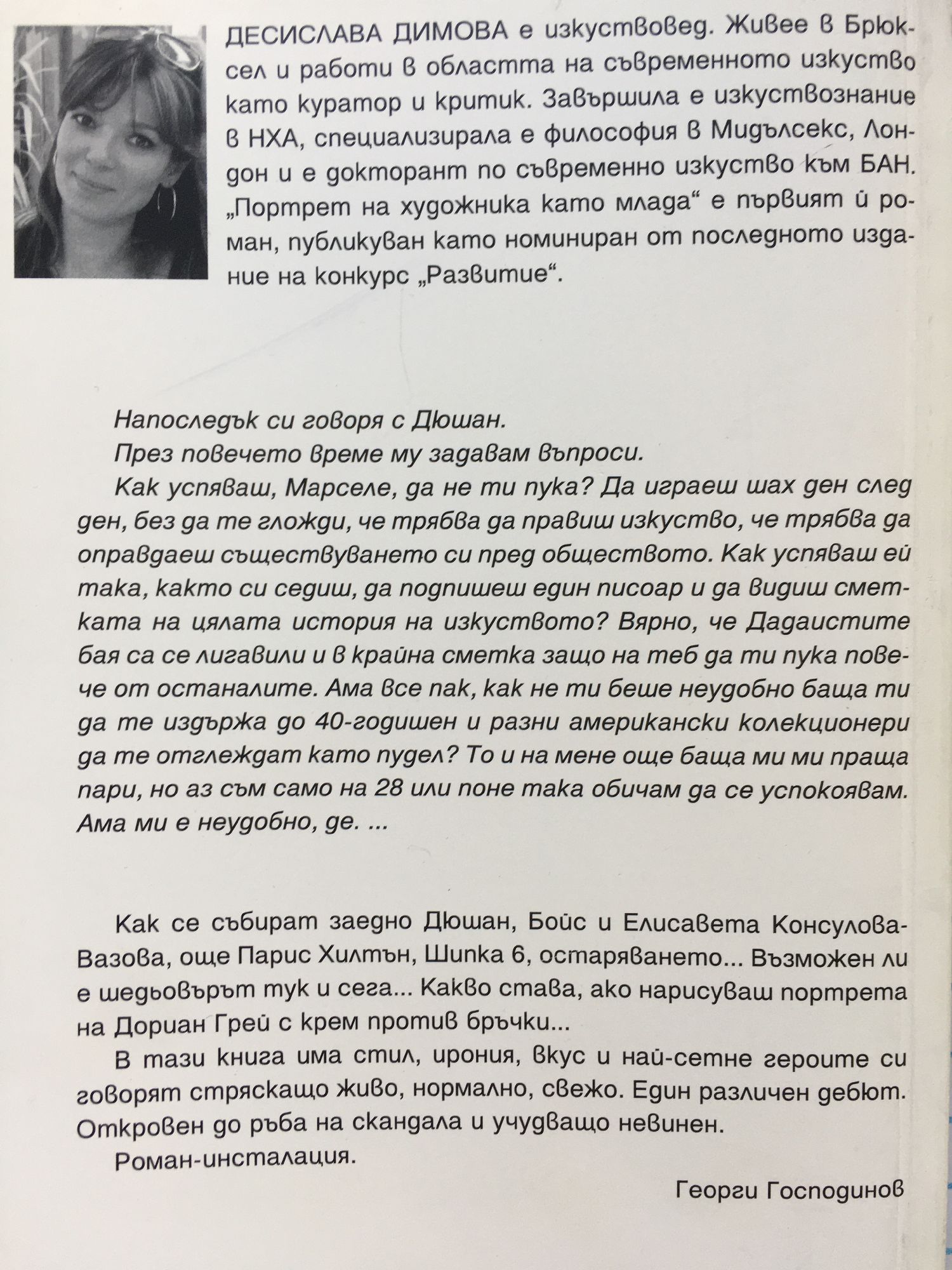 Десислава Димова е изкуствовед. Живее в Брюксел и работи в областта на съвременното изкуство като куратор и критик. Завършила е изкуствознание в НХА, специализирала е философия в Мидълсекс, Лондон и е докторант по съвременно изкуство към БАН. "Портрет на художника като млада" е първият й роман. Той се издава като номиниран за наградата на Фондация "Развитие 21". „Как се събират заедно Дюшан, Бойс и Елисавета Консулова-Вазова, още Парис Хилтън, Шипка 6, остаряването...Възможен ли е шедьовърът тук и сега... Какво става, ако нарисуваш портрета на Дориан Грей с крем против бръчки...В тази книга има стил, ирония, вкус и най-сетне героите си говорят стряскащо живо, нормално, свежо. Един различен дебют. Откровен до ръба на скандала и учудващо невинен. Роман-инсталация." - Георги Господинов