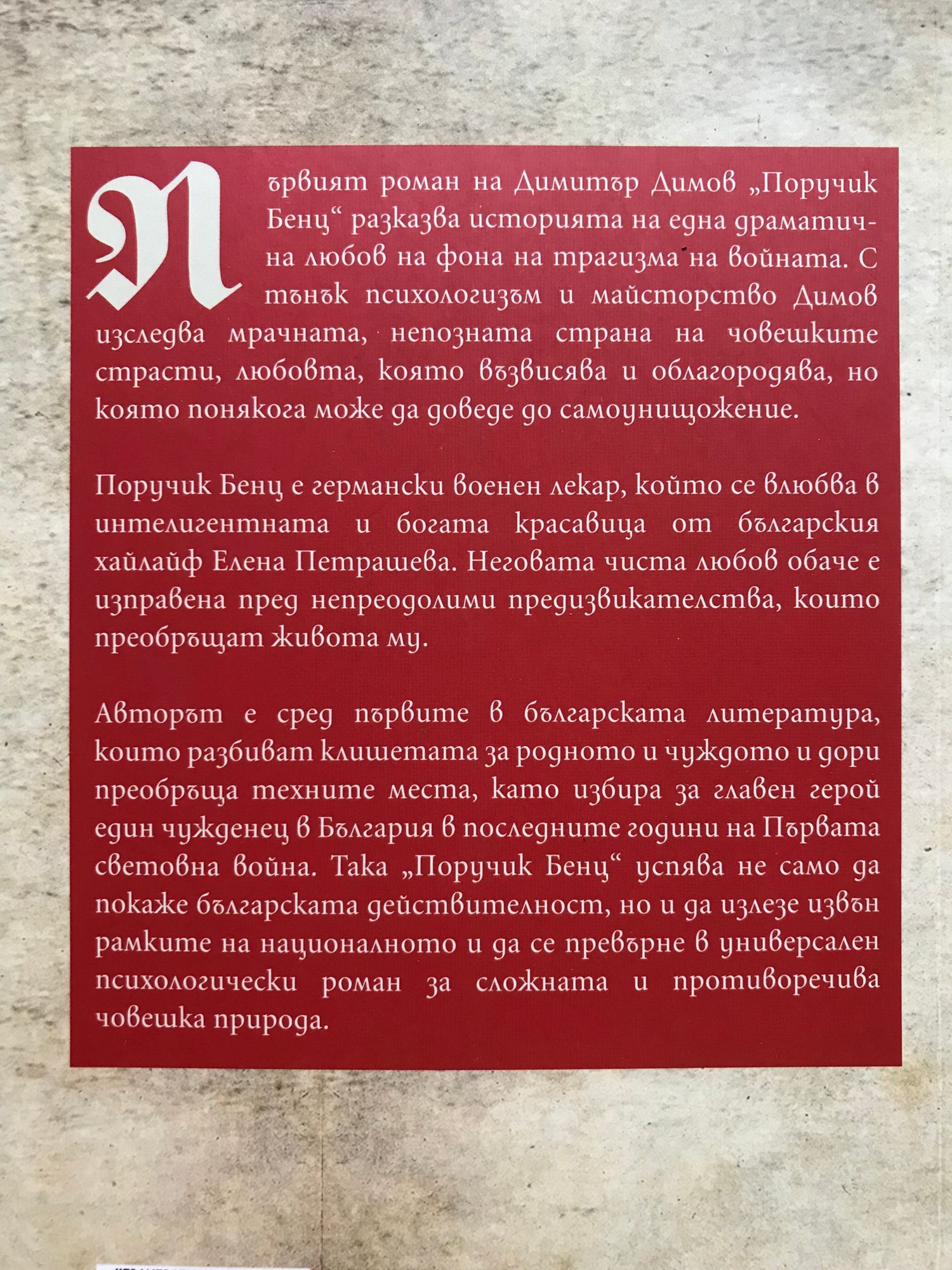 Първият роман на Димитър Димов „Поручик Бенц“ разказва историята на една драматична любов на фона на трагизма на войната. С тънък психологизъм и майсторство Димов изследва мрачната, непозната страна на човешките страсти, любовта, която възвисява и облагородява, но която понякога може да доведе до самоунищожение. Поручик Бенц е германски военен лекар, който се влюбва в интелигентната и богата красавица от българския хайлайф Елена Петрашева. Неговата чиста любов обаче е изправена пред непреодолими предизвикателства, които преобръщат живота му. Авторът е сред първите в българската литература, които разбиват клишетата за родното и чуждото и дори преобръща техните места, като избира за главен герой един чужденец в България в последните години на Първата световна война. Така „Поручик Бенц“ успява не само да покаже българската действителност, но и да излезе извън рамките на националното и да се превърне в универсален психологически роман за сложната и противоречива човешка природа.