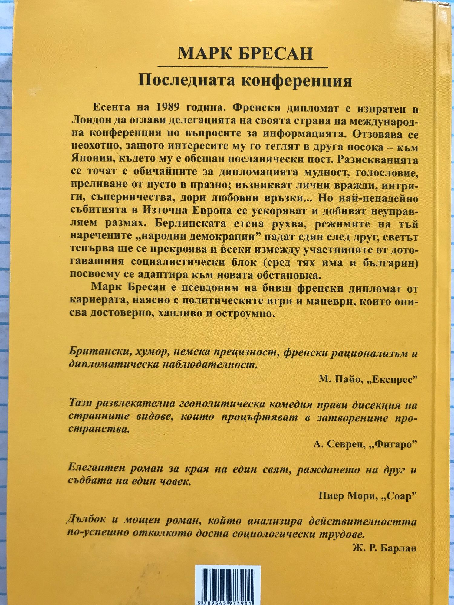 Есента на 1989 година. Френски дипломат е изпратен в Лондон да оглави делегацията на своята страна на международна конференция по въпросите за информацията. Отзовава се неохотно, защото интересите му го теглят в друга посока - към Япония, където му е обещан посланически пост. Разискванията се точат с обичайните за дипломацията мудност, голословие, преливане от пусто в празно; възникват лични вражди, интриги, съперничества, дори любовни връзки... Но най-ненадейно събитията в Източна Европа се ускоряват и добиват неуправляем размах. Берлинската стена рухва, режимите на тъй наречените "неародни демокрации" падат един след друг, светът тепърва ще се прекроява и всеки измежду участниците от дотогавашния социалистически блок (сред тях има и българин) по своему се адаптира към новата обстановка. Марк Бресан е псевдоним на бивш френски дипломат от кариерата, наясно с политическите игри и маневри, които описва достоверно, хапливо и остроумно.