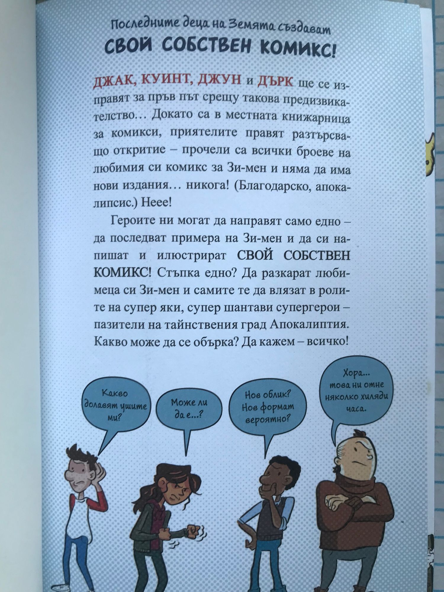 Последните деца на Земята създават свой собствен комикс! Джак, Куинт, Джун и Дърк ще се изправят за пръв път срещу такова предизвикателство в „Последните комикси на Земята“... Докато са в местната книжарница за комикси, приятелите правят разтърсващо откритие - прочели са всички броеве на любимия си комикс за Зи-мен и няма да има нови издания... никога! (Благодарско, апокалипсис.) Нее! Героите ни могат да направят само едно - да последват примера на Зи-мен и да си напишат и илюстрират свой собствен комикс! Какво може да се обърка? Да кажем - всичко!