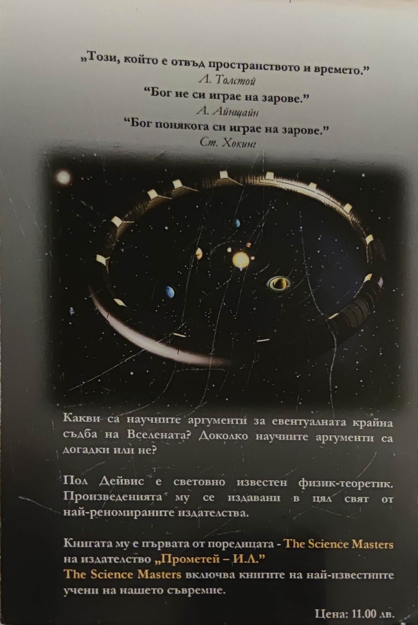 Какви са научните аргументи за евентуалната крайна съдба на Вселената? Доколко научните аргументи са догадки или не? Пол Дейвис е световно известен физик-теоретик. Произведенията му са издавани в цял свят от най-реномираните издателства. Книгата му е първата от поредицата "The Science Masters" на издателство "Прометей - И.Л.". "The Science Masters" включва книгите на най-известните учени на нашето съвремие. " Този, който е отвъд пространството и времето..." Л. Толстой " Бог не си играе на зарове..." А. Айнщайн " Бог понякога си играе на зарове..." Ст. Хокинг