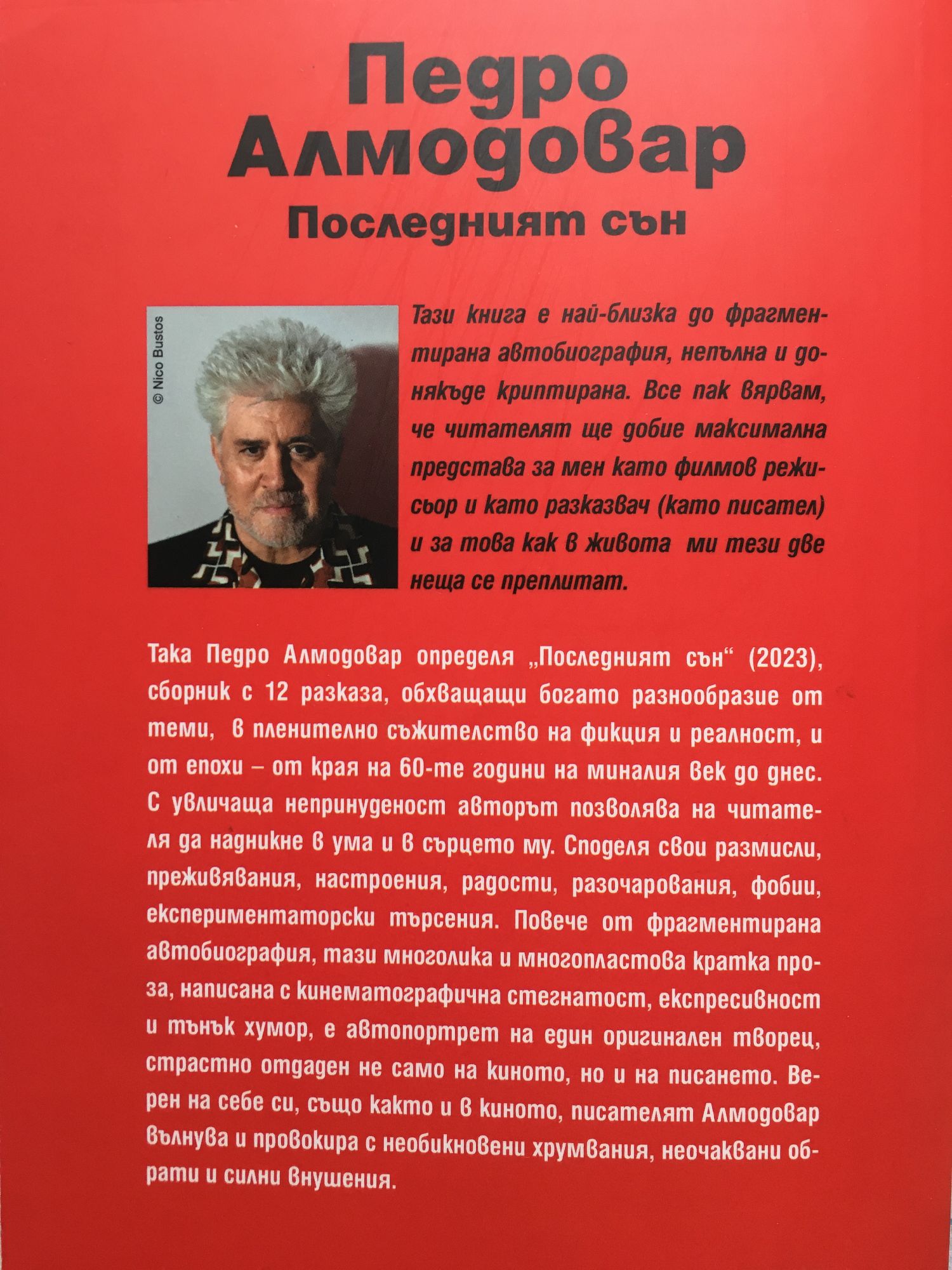 Тази книга е най-близка до фрагментирана автобиография, непълна и донякъде криптирана. Все пак вярвам, че читателят ще добие максимална представа за мен като филмов режисьор и като разказвач (като писател) и за това как в живота ми тези две неща се преплитат. Така Педро Алмодовар определя „Последният сън“ (2023), сборник с 12 разказа, обхващащи богато разнообразие от теми, в пленително съжителство на фикция и реалност, и от епохи – от края на 60-те години на миналия век до днес. С увличаща непринуденост авторът позволява на читателя да надникне в ума и в сърцето му. Споделя свои размисли, преживявания, настроения, радости, разочарования, фобии, експериментаторски търсения. Повече от фрагментирана автобиография, тази многолика и многопластова кратка проза, написана с кинематографична стегнатост, експресивност и тънък хумор, е автопортрет на един оригинален творец, страстно отдаден не само на киното, но и на писането. Верен на себе си, също както и в киното, писателят Алмодовар вълнува и провокира с необикновени хрумвания, неочаквани обрати и силни внушения. Прозата на Алмодовар е също толкова изкусна и гениална, колкото и филмите му. В. „Таймс“