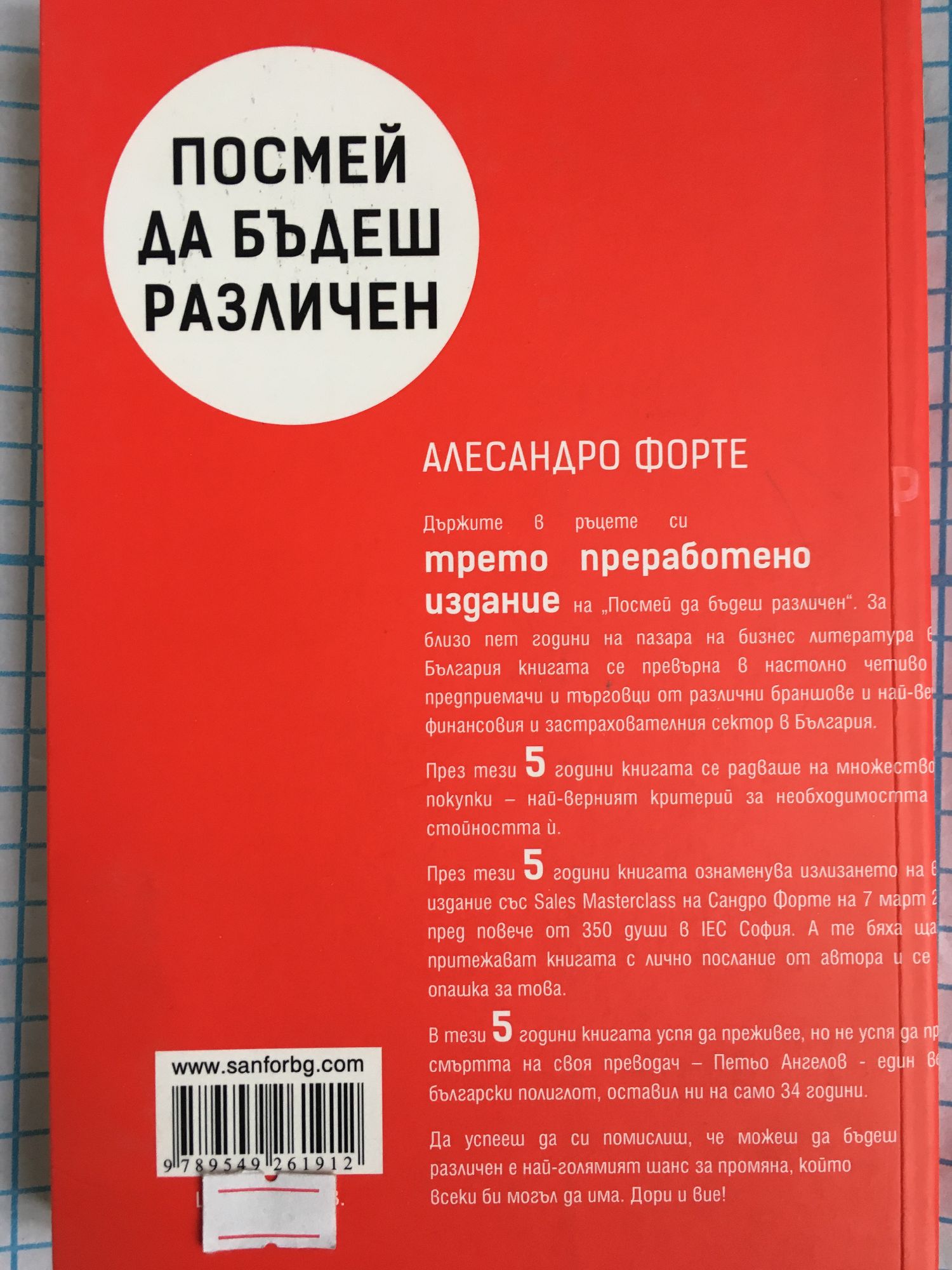 "Посмей да бъдеш различен" е бизнес-книга, която не прилича на никоя друга. Тя представлява цялостен пътеводител за онези, които наистина искат да се отличат от останалите и да се изкачат на върха. "Удивително е колко много хора продължават да се мъчат с бизнес, който всъщност не могат да контролират... Проблемът е, че не се стремим да се концентрираме върху нашите силни страни, въпреки необходимостта да го правим периодично, защото делегирането изглежда трудна работа... Ако анализираме в детайли начина, по който водим бизнеса си, вероятно ще открием десетки и десетки задачи, които изискват нашето време, но действително само някои от тях имат подчертано търговски смисъл. Следователно въпросът е: какво искате – да оцелявате или да преуспявате?" "Посмей да бъдеш различен" е за предприемачите, финансовите консултанти, застрахователните посредници, които мислят за себе си като за собственици на бизнес. Тази книга е за тези, които наистина очакват и вярват, че могат и искат да постигнат своите амбиции. За всички вас, които действително сте решени на това – купете си книгата, поемете риска и посмейте да бъдете различни. Сандро (Алесандро Форте) започва своята кариера в сферата на финансовите услуги, когато е едва на 21 години. В рамките само на две години Сандро се утвърждава измежду топ-продавачите в голяма животозастрахователна компания във Великобритания. През 1993 година става мениджър в друга голяма животозастрахователна компания и като такъв се отличава с изключителни резултати както в продажбите, така и в набирането на финансови консултанти. Три години по-късно Сандро решава, че е време да започне свой собствен бизнес – самостоятелна практика за финансово консултиране, която расте оттогава с огромни темпове всяка година. За да достигне днес до група от компании, обединяваща общозастрахователен и животозастрахователен бизнес, франчайз на брокери за финансово консултиране и ипотечен брокер. Неговите семинари, презентации и занятия вече са оказали своето положително въздействие върху стотици хиляди хора, а книгата "Посмей да бъдеш различен" става незабавно бестселър в Източна Европа и Далечния Изток. Сандро е извънредно популярен лектор и е един от най-младите и крайно успешни предприемачи в своята област. Неговият ентусиазъм, ангажираност и енергия привнасят значителна добавена стойност на всяко събиране, тренинг или конференция.