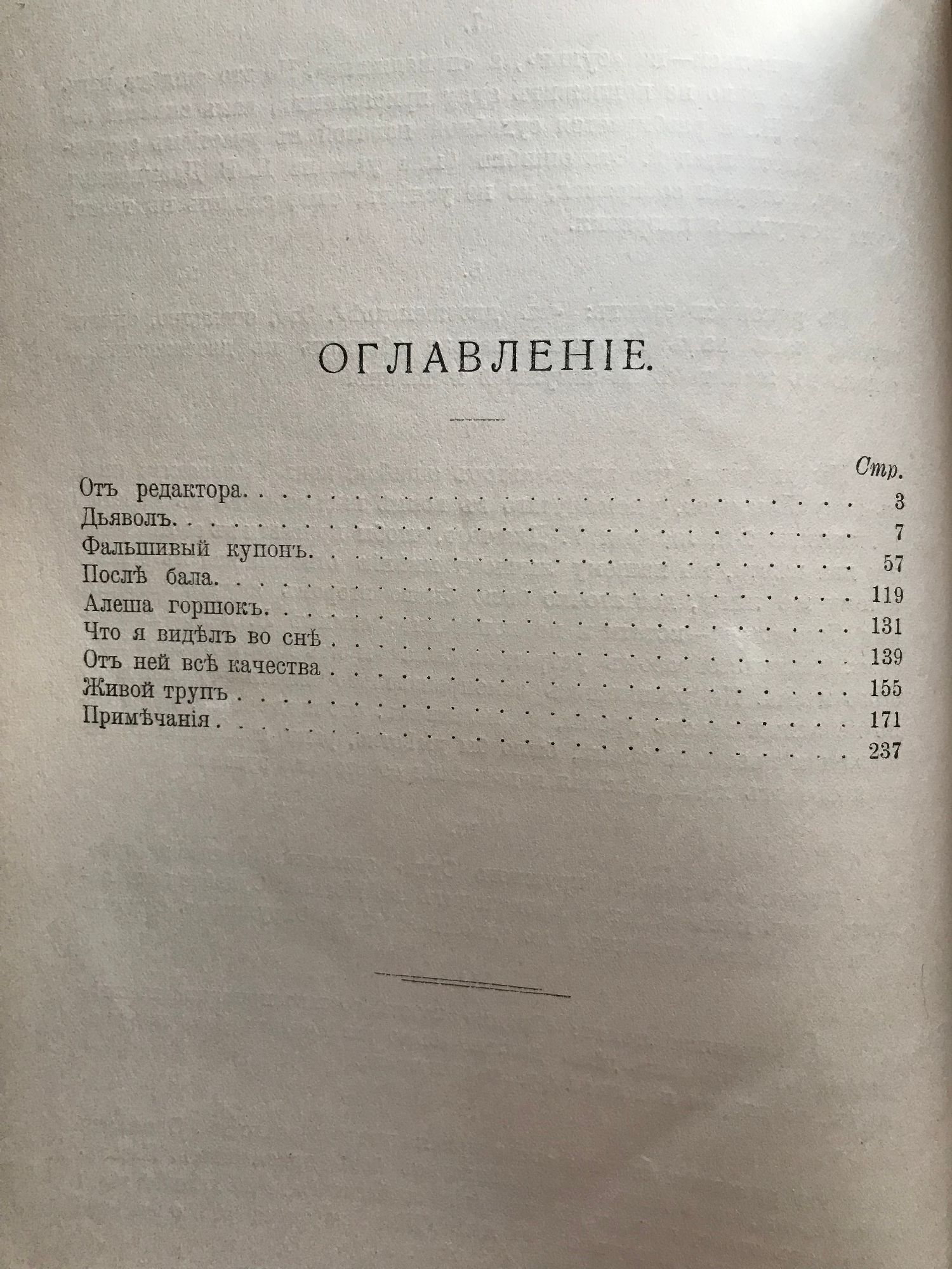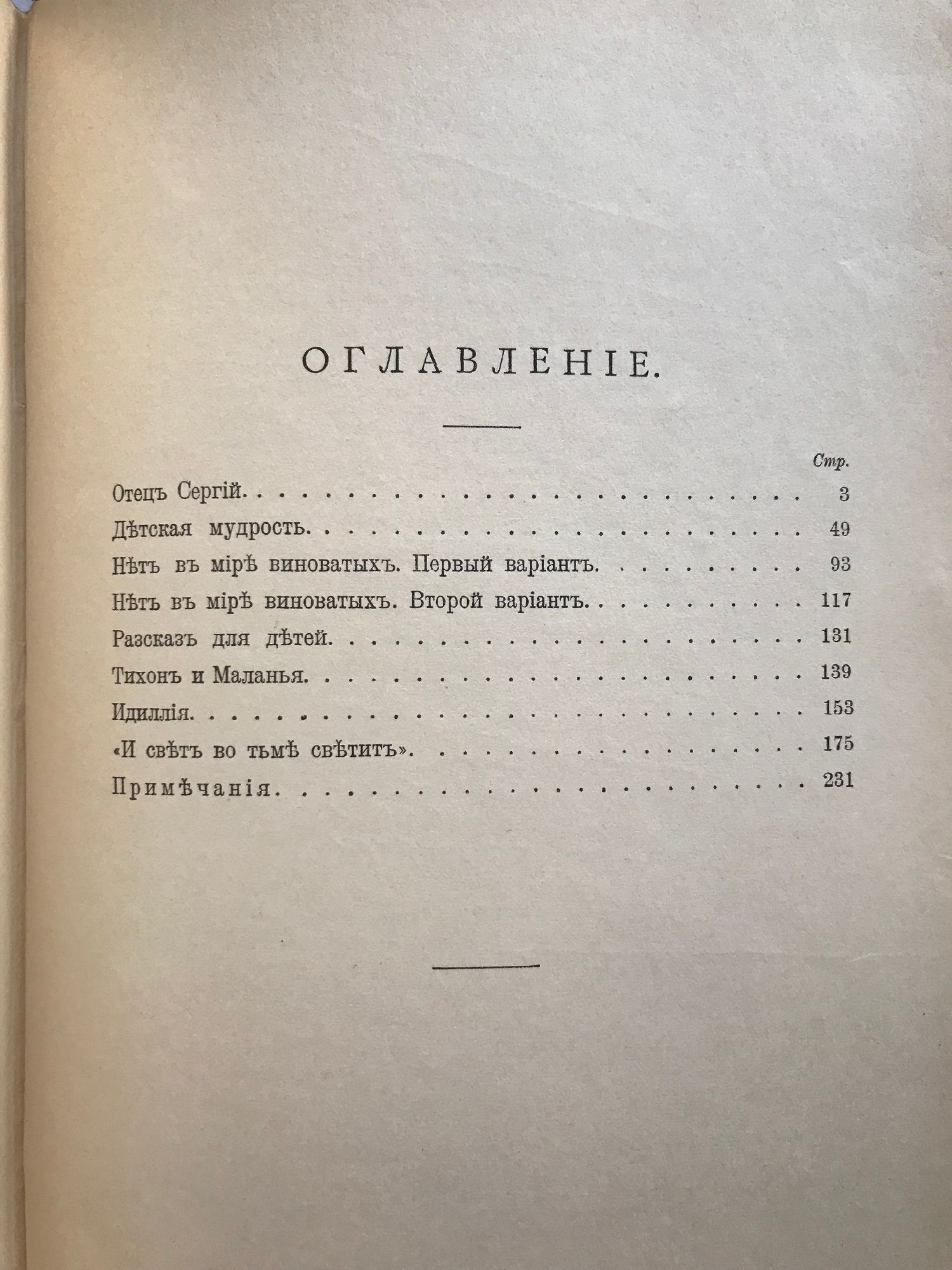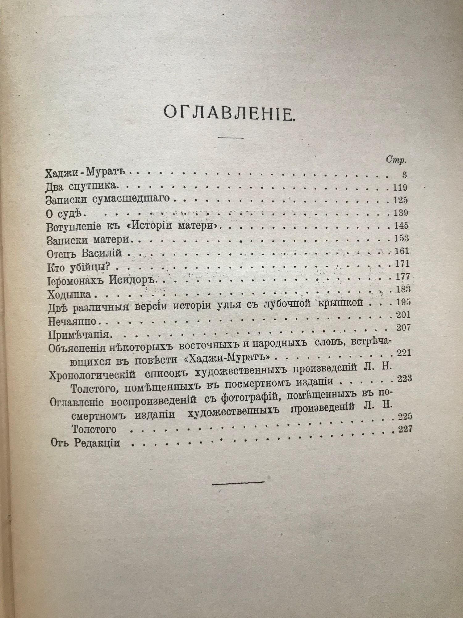 Том 1: Дьяволъ. Фальшивый купонъ. После бала. Алеша Горшокъ. Что я виделъ во сне. Отъ ней все качества. Живой трупъ. Том 2: Отецъ Сергiй. Детская мудрость. Нетъ въ мiре виноватыхъ. Разсказъ для детей. Тихонъ и маланья. Идиллiя. "И свеъ во тьме светитъ". Том 3: Хаджи-Муратъ. Два спутника. Записки Сумасшедшаго. О суде. Вступленiе къ исторiи матери. Записки матери. Отецъ Василiй. Кто убiцы? Iеромонахъ Исидоръ. Ходынка. Две различныя версiм исторiи улья. Нечаянно.