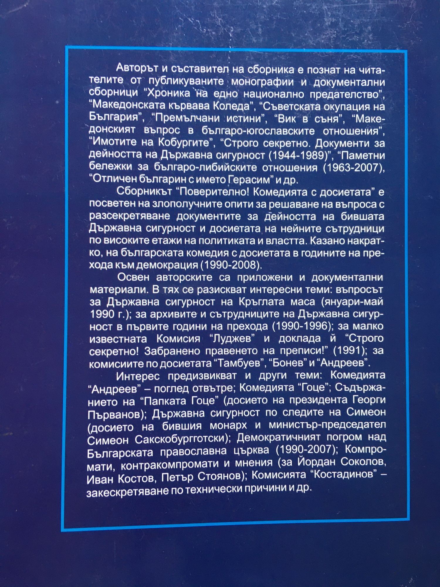Авторът и съставител на сборника е познат на читателите от публикуваните монографии и документални сборници "Хроника на едно национално предателство", "Македонската кървава Коледа", "Съветската окупация на България", "Премълчани истини", "Вик в съня", "Македонският въпрос в българо-югославските отношения", "Имотите на Кобургите", "Строго секретно. Документи за дейността на Държавна сигурност (1944-1989)", "Паметни бележки за българо-либийските отношения (1963-2007), "Отличен българин с името Герасим" и др. Сборникът "Поверително! Комедията с досиетата" е посветен на злополучните опити за решаване на въпроса с разсекретяване документите за дейността на бившата Държавна сигурност и досиетата на нейните сътрудници по високите етажи на политиката и властта. Казано накратко, на българската комедия с досиетата в годините на прехода към демокрация (1990-2008). Освен авторските са приложени и документални материали. В тях се разискват интересни теми: въпросът за Държавна сигурност на Кръглата маса (януари-май 1990 г.); за архивите и сътрудниците на Държавна сигурност в първите години на прехода (1990-1996); за малко известната Комисия "Луджев" и доклада й "Строго секретно! Забранено правенето на преписи!" (1991); за комисиите по досиетата "Тамбуев", "Бонев" и "Андреев". Интерес предизвикват и други теми: Комедията "Андреев" - поглед отвътре; Комедията "Гоце"; Съдържанието на "Папката Гоце" (досието на президента Георги Първанов); Държавна сигурност по следите на Симеон (досието на бившия монарх и министър-председател Симеон Сакскобургготски); Демократичният погром над Българската православна църква (1990-2007); Компромати, контракомпромати и мнения (за Йордан Соколов, Иван Костов, Петър Стоянов); Комисията "Костадинов" - закескретяване по технически причини и др.