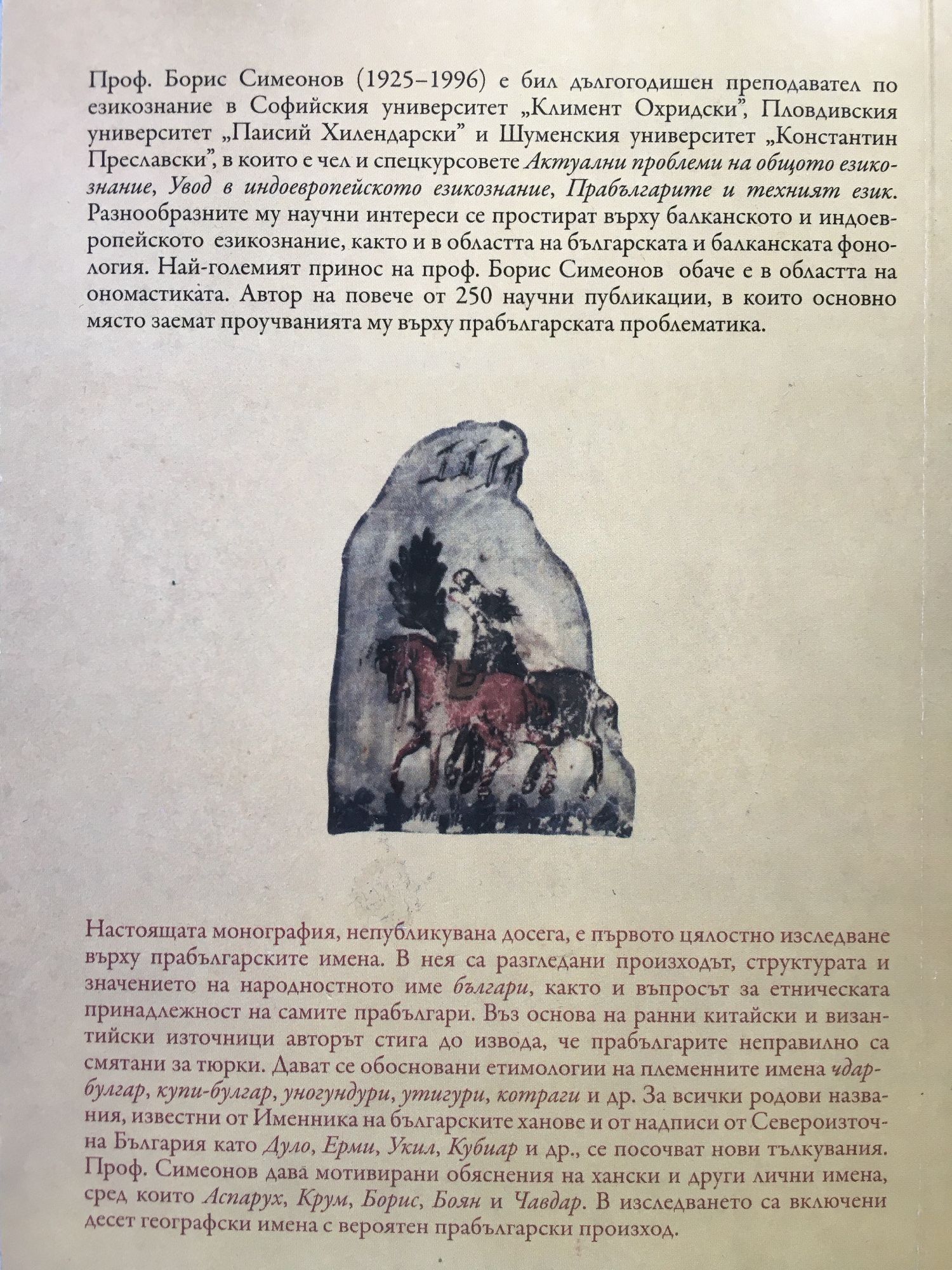 Проф. Борис Симеонов (1925-1996) е бил дългогодишен преподавател по езикознание в Софийския университет „Климент Охридски", Пловдивския университет „Паисий Хилендарски" и Шуменския университет „Константин Преславски", в които е чел и спецкурсовете "Актуални проблеми на общото езикознание", "Увод в индоевропейското езикознание", "Прабългарите и техният език". Разнообразните му научни интереси се простират върху балканското и индоевропейското езикознание, както и в областта на българската и балканската фонология. Най-големият принос на проф. Борис Симеонов обаче е в областта на ономастиката. Автор на повече от 250 научни публикации, в които основно място заемат проучванията му върху прабългарската проблематика. Настоящата монография, непубликувана досега, е първото цялостно изследване върху прабългарските имена. В нея са разгледани произходът, структурата и значението на народностното име българи, както и въпросът за етническата принадлежност на самите прабългари. Въз основа на ранни китайски и византийски източници авторът стига до извода, че прабългарите неправилно са смятани за тюрки. Дават се обосновани етимологии на племенните имена чдар-булглр, купи-булгар, уногундури, утигури, котраги и др. За всички родови названия, известни от Именника на българските ханове и от надписи от Североизточна България като Дуло, Ерми, Укил, Кубиар и др., се посочват нови тълкувания. Проф. Симеонов дава мотивирани обяснения на хански и други лични имена, сред които Аспарух, Крум, Борис, Боян и Чавдар. В изследването са включени десет географски имена с вероятен прабългарски произход.