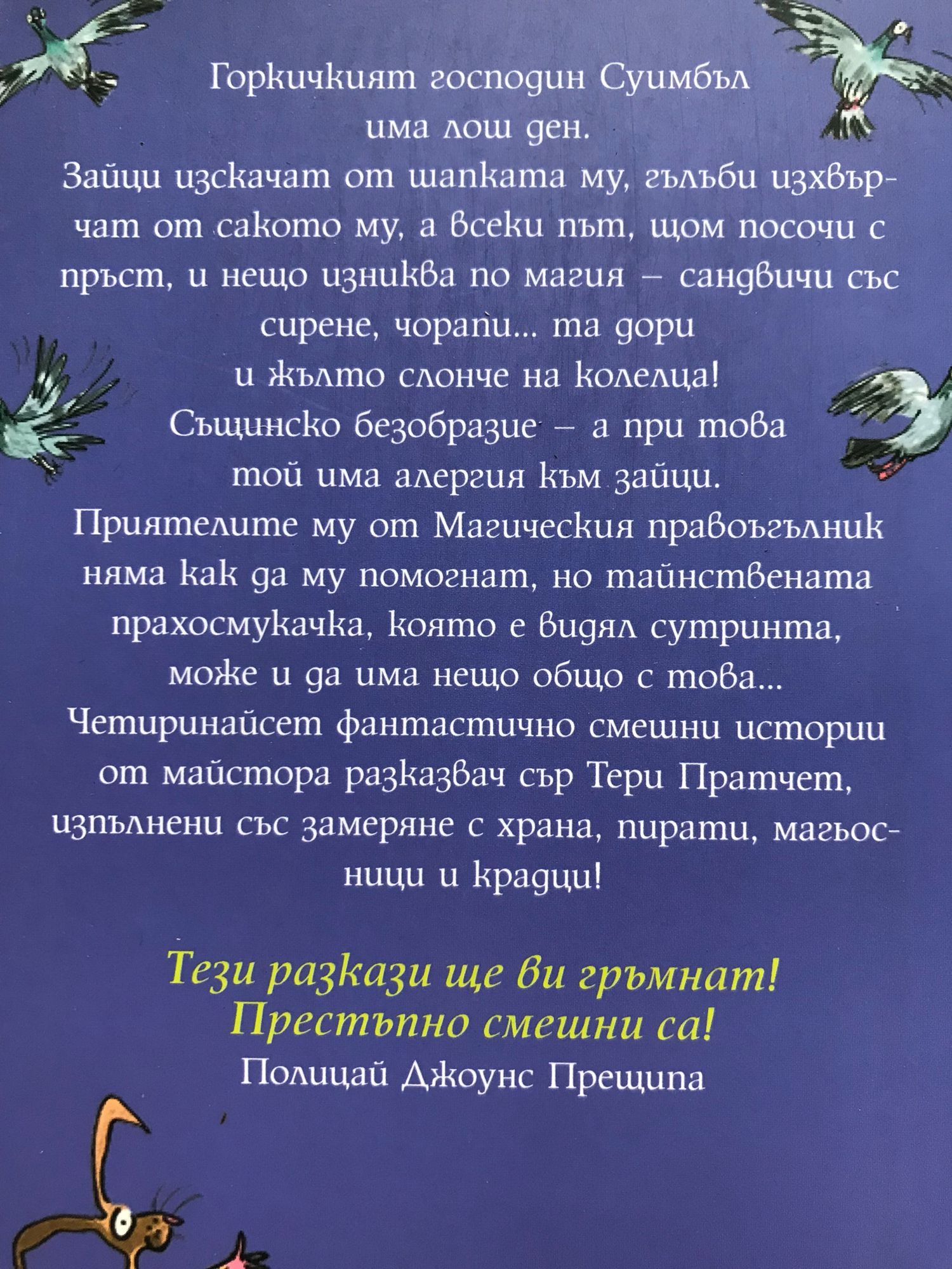 Горкичкият господин Суимбъл има лош ден. Зайци изскачат от шапката му, гълъби изхвърчат от сакото му, а всеки път, щом посочи с пръст, и нещо изниква по магия - сандвичи със сирене, чорапи... та дори и жълто слонче на колелца! Същинско безобразие - а при това той има алергия към зайци. Приятелите му от Магически правоъгълник няма как да му помогнат, но тайнствената прахосмукачка, която е видял сутринта, може и да има нещо общо с това... Четиринайсет фантастично смешни истории от майстора разказвач сър Тери Пратчет, изпълнени със замеряне с храна, пирати, магьосници и крадци! "Тези разкази ще ви гръмнат! Престъпно смешни са!" Полицай Джоунс Прещипа