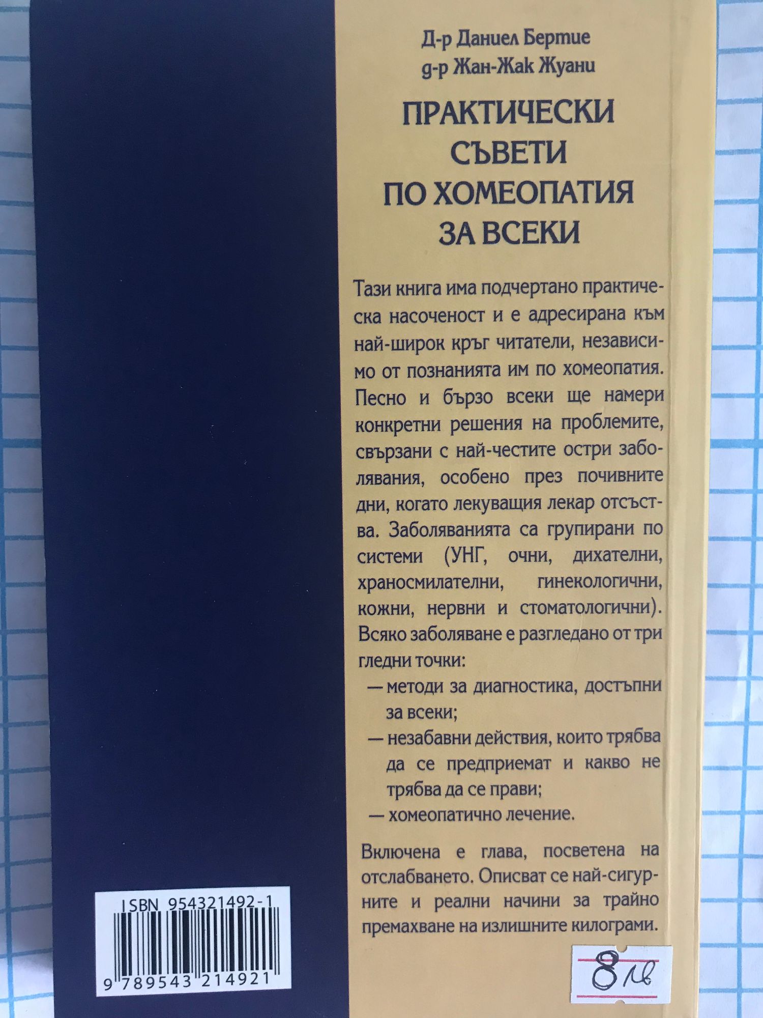 Тази книга има подчертано практическа насоченост и е адресирана към най-широк кръг читатели, независимо от познанията им по хомеопатия. Лесно и бързо всеки ще намери конкретни решения на проблемите, свързани с най-честите остри заболявания, особено през почивните дни, когато лекуващия лекар отсъства. Заболяванията са групирани по си-стеми (УНЦ очни, дихателни, храносмилателни, гинекологични, кожни, нервни и стоматологични). Всяко заболяване е разгледано от три гледни точки: — методи за диагностика, достъпни за всеки; — незабавни действия, които трябва да се предприемат и какво не трябва да се прави; — хомеопатично лечение. Включена е глава, посветена на отслабването. Описват се най-сигурните и реални начини за трайно премахване на излишните килограми.