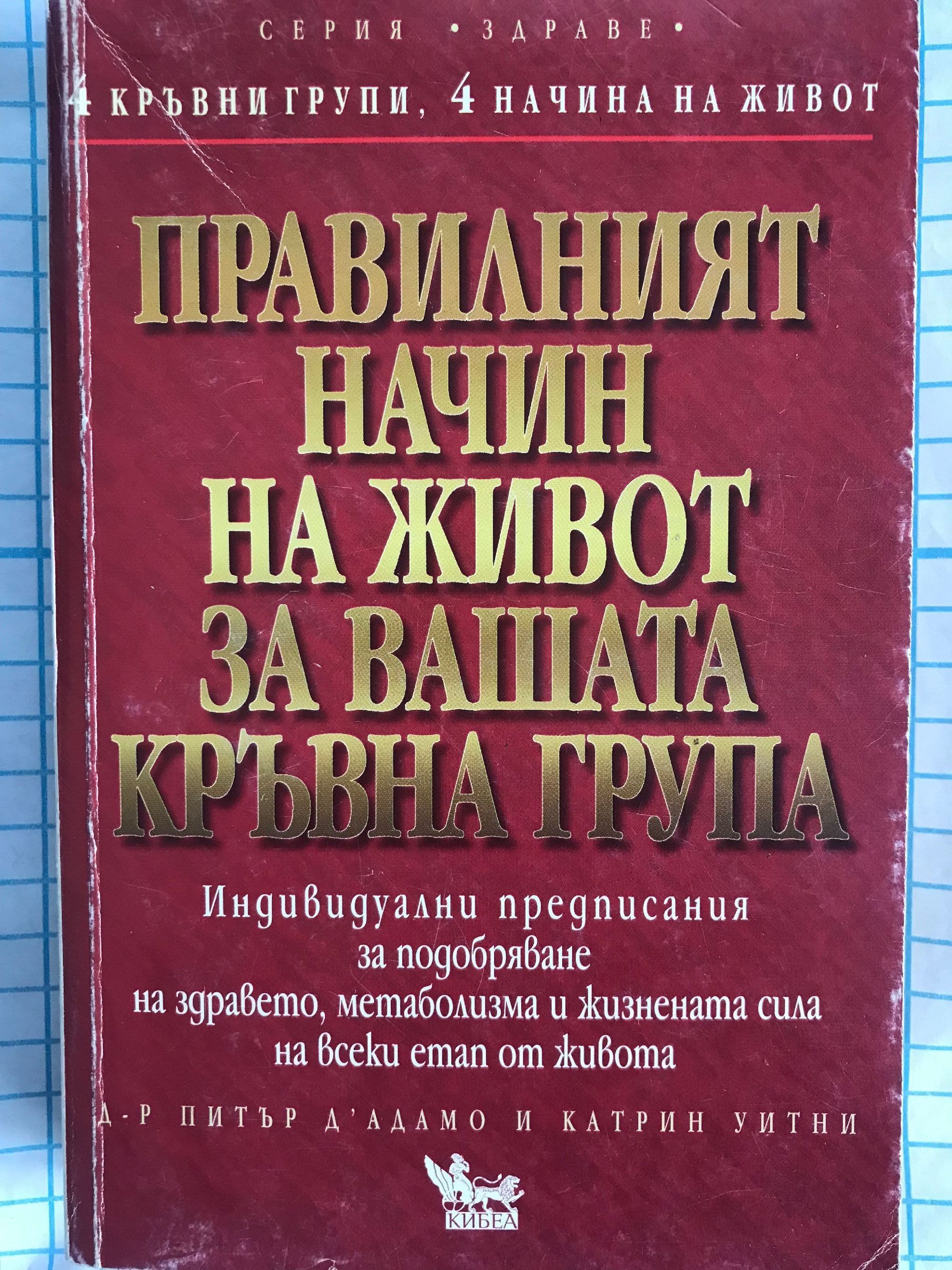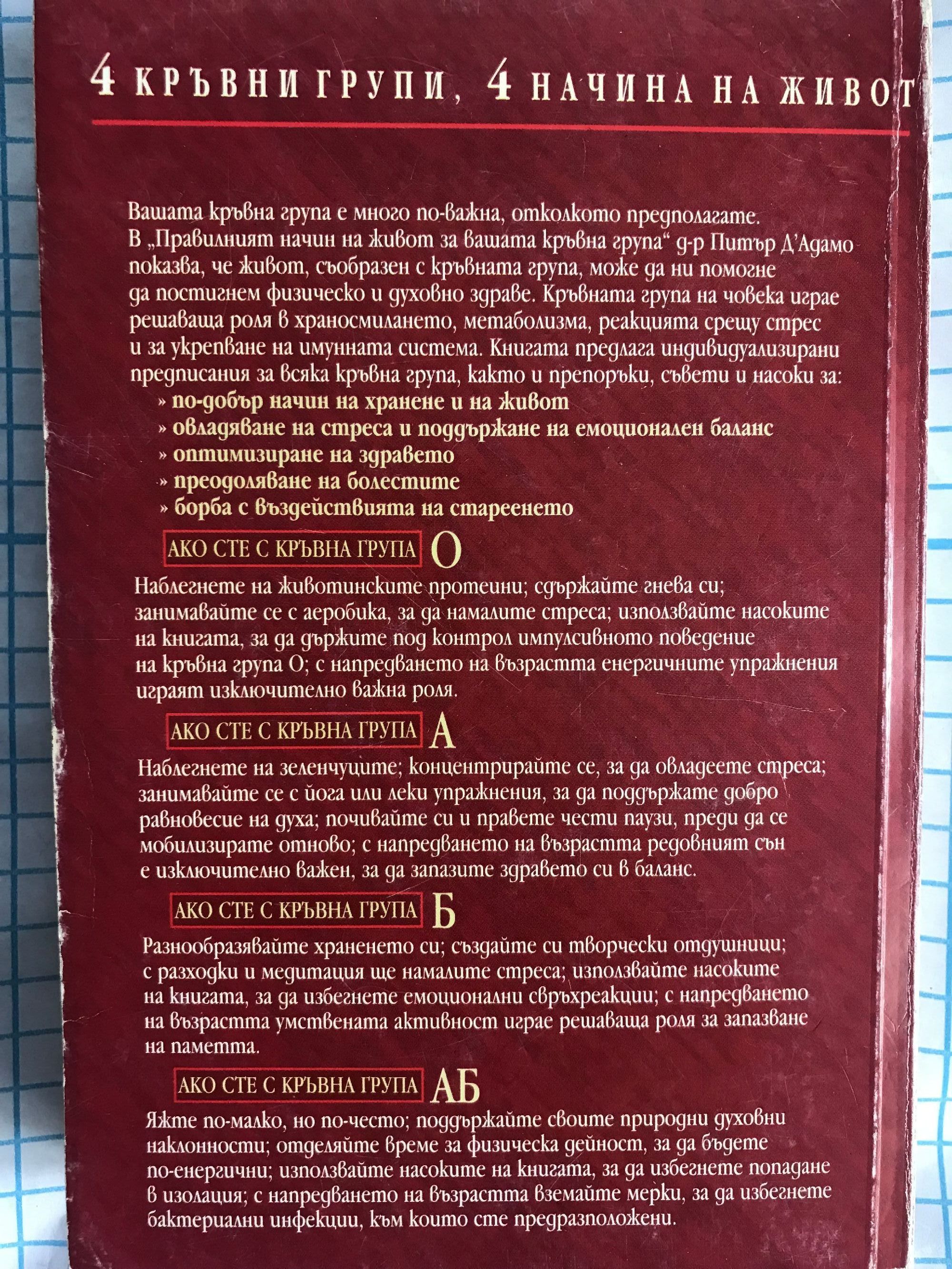 Вашата кръвна група е много по-важна, отколкото предполагате. В "Правилният начин на живот за вашата кръвна група" д-р Питър Д'Адамо показва, че живот, съобразен с кръвната група, може да ни помогне да постигнем физическо и духовно здраве. Кръвната група на човека играе решаваща роля в храносмилането, метаболизма, реакцията срещу стрес и за укрепване на имунната система. Книгата предлага индивидуализирани предписания за всяка кръвна група, както и препоръки, съвети и насоки за: по-добър начин на хранене и на живот; овладяване на стреса и поддържане на емоционален баланс; оптимизиране на здравето; преодоляване на болестите; борба с въздействията на стареенето