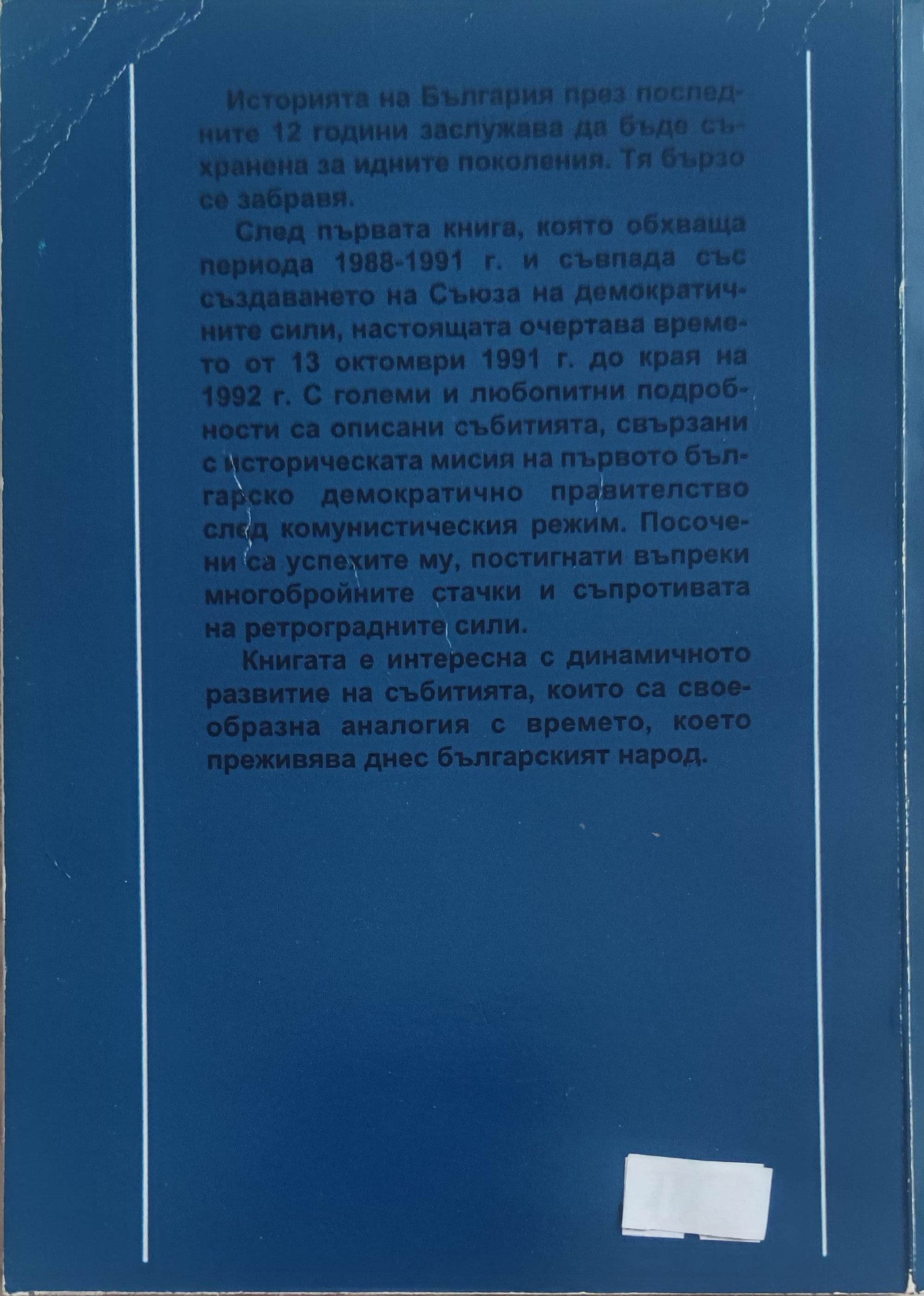Историята на България през последните 12 години заслужава да бъде съхранена за идните поколения. Тя бързо се забравя. След първата книга, която обхваща периода 1988-1991 г. и съвпада със създаването на Съюза на демократичните сили, настоящата очертава времето от 13 октомври 1991 г. до края на 1992 г. С големи и любопитни подробности са описани събитията, свързани с историческата мисия на първото българско демократично правителство след комунистическия режим. Посочени са успехите му, постигнати въпреки многобройните стачки и съпротивата на ретроградните сили. Книгата е интересна с динамичното развитие на събитията, които са своеобразна аналогия с времето, което преживява днес българският народ.