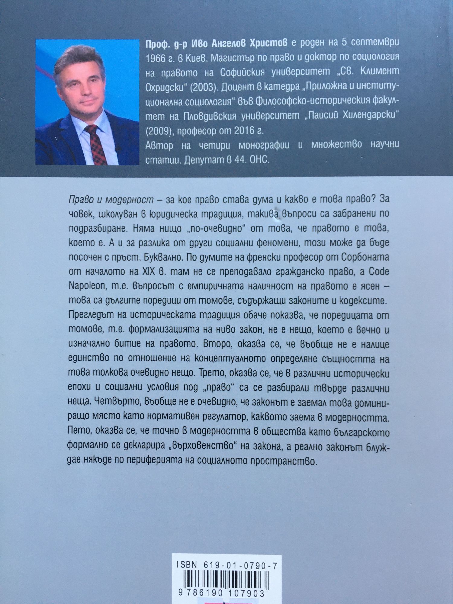 Право и модерност – за кое право става дума и какво е това право? За човек, школуван в юридическа традиция, такива въпроси са забранени по подразбиране. Няма нищо „по-очевидно“ от това, че правото е това, което е. А и за разлика от други социални феномени, този може да бъде посочен с пръст. Буквално. По думите на френски професор от Сорбоната от началото на XIX в. там не се преподавало гражданско право, a Code Napoleon, т.е. въпросът с емпиричната наличност на правото е ясен — това са дългите поредици от томове, съдържащи законите и кодексите. Прегледът на историческата традиция обаче показва, че поредицата от томове, т.е. формализацията на ниво закон, не е нещо, което е вечно и изначално битие на правото. Второ, оказва се, че въобще не е налице единство по отношение на концептуалното определяне същността на това толкова очевидно нещо. Трето, оказва се, че в различни исторически епохи и социални условия под „право“ са се разбирали твърде различни неща. Четвърто, въобще не е очевидно, че законът е заемал това доминиращо място като нормативен регулатор, каквото заема в модерността. Пето, оказва се, че точно в модерността в общества като българското формално се декларира „върховенство“ на закона, а реално законът блуждае някъде по периферията на социалното пространство. Проф. д-р Иво Ангелов Христов е роден е на 5 септември 1966 г. в Киев. Магистър по право и доктор по социология на правото на Софийския университет „Св. Климент Охридски“ (2003). Доцент в катедра „Приложна и институционална социология“ във Философско-историческия факултет на Пловдивския университет „Паисий Хилендарски“ (2009), професор от 2016 г. Автор на четири монографии и множество научни статии. Депутат в 44. ОНС.